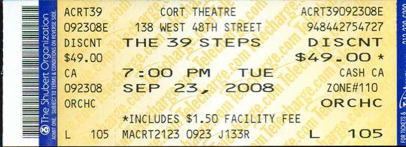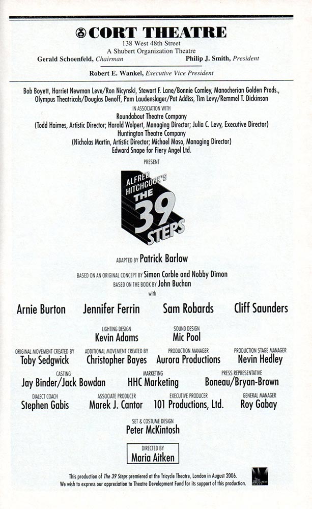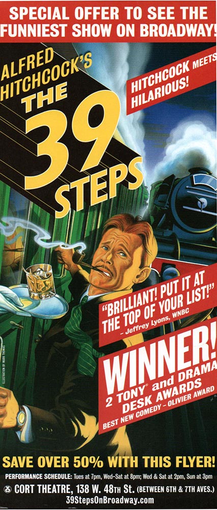 Two years later I was in New York City and stumbled across a cast signing at the big Borders bookstore in the Time Warner Building at Columbus Circle (only one of those three locations still exists). I got a poster signed (for the life of me, I can’t read any of the signatures, but it still occupies a place of importance above my toilet) and mentioned I saw the original play in London; they told me I had to come see “their” version. To be honest, I found the New York version extremely dumbed down, opening with an incredibly lame Alfred Hitchcock lookalike contest before the play started. In London, the play was called just The 39 Steps; in the U.S. it was called Alfred Hitchcock’s The 39 Steps. It maintained the same staging and four-person cast, but it wasn’t the same. I saw the play in the Cort Theatre, a rather ramshackle, rundown space, which used to be the home of The Merv Griffin Show when it was owned by Group W (Westinghouse), my former employer when I worked for KDKA-TV in Pittsburgh. I still enjoyed this version of the play, but the London one was truly special, partly because it was my first time in that city and my first play there. The 39 Steps ran on Broadway for 771 performances (with 23 previews) from January 4, 2008 through January 10, 2010. It eventually moved to the American Airlines Theatre.