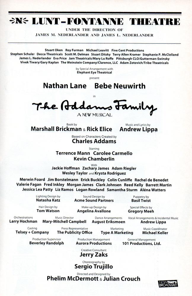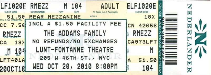 I’ve always liked the work of cartoonist Charles Addams, and as a kid, I watched the TV sitcom version of The Addams Family, starring John Astin and Carolyn Jones, the latter of whom I found devastatingly sexy as much as a 9-year-old can conceive devastatingly sexy to be at that age. The Broadway play based on Addams’s characters was a huge hit and starred Nathan Lane and Bebe Neuwirth and I was lucky enough to see them both the night I attended in October 2010. This production had the most amazing set design I’ve ever seen in a Broadway show, and it’s almost impossible to describe, but I remember it as being able to see the whole Addams Family house at some points and it rotating to reveal various rooms. Lane was in rare form that night, setting his sights on one cast member and just generally f-ing with him throughout the performance, trying to make him break character and laugh. He was successful a number of times, much to my–and the audience’s–delight. The Addams Family ran for 722 performances (with 35 previews) from March 8, 2010 through December 31, 2011. At one point, Lane and Neuwirth were replaced by Roger Rees as Gomez and Brooke Shields as Morticia, which makes me very happy I saw the original cast!