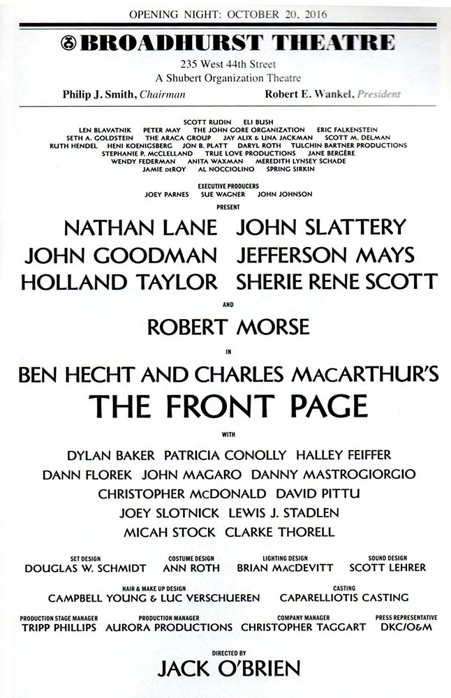 The Front Page ran for 117 performances (with 32 previews) from September 20, 2016 through January 29, 2017.