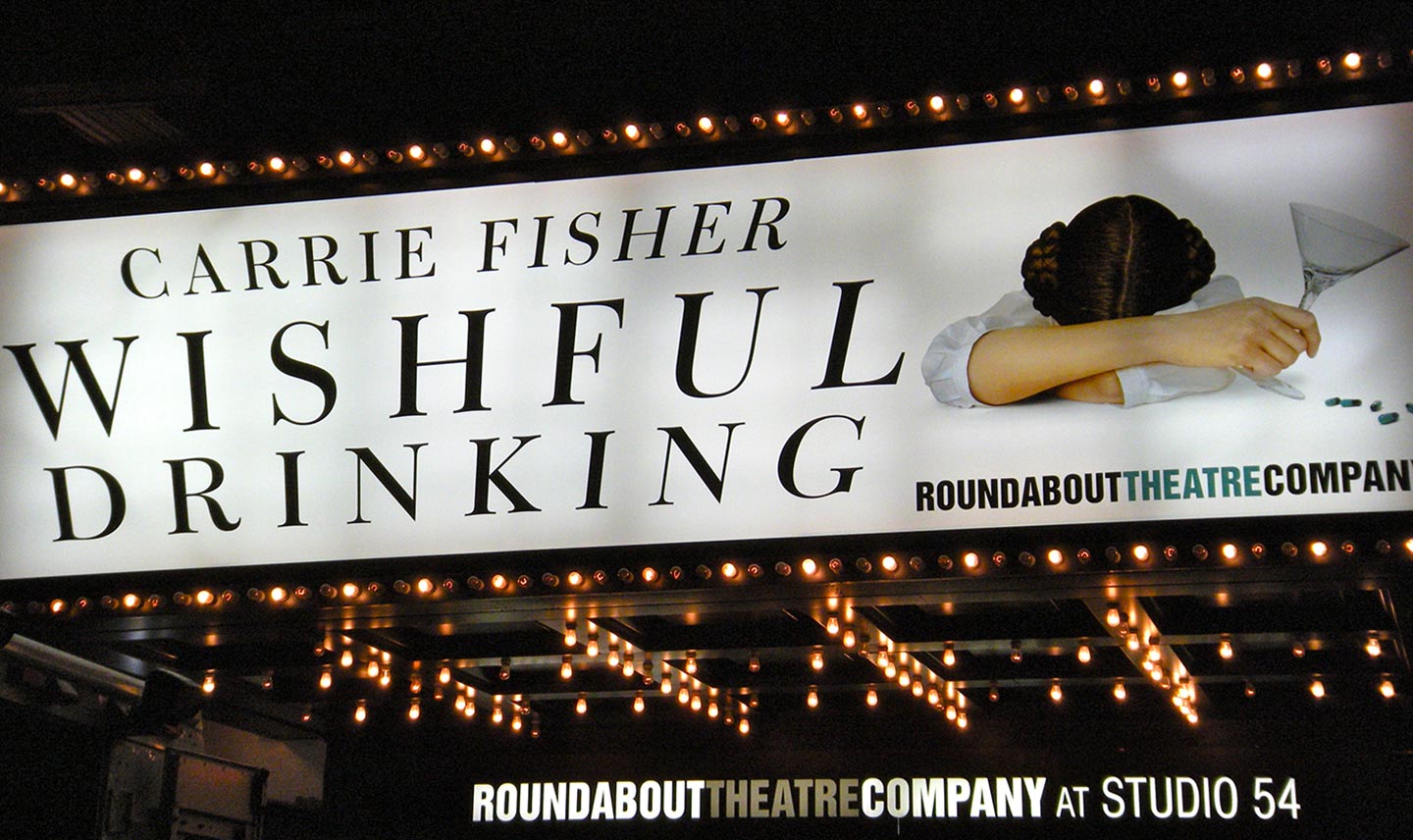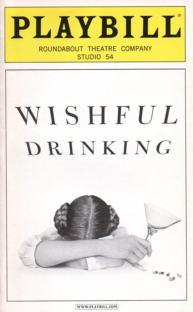 In the fall of 2009 I was roaming around a very crowded Times Square one night when I spied a young woman dressed up as Princess Leia from Star Wars. She was very tiny, and as I approached her and got a better look at her, I noticed that she was wearing a sandwich board in addition to her white gown and ear-muff wig. The board was an ad that said something like “Follow Me to a Galaxy Far, Far Away,” and the front side said something like “Ask Me About Discount Tickets for Wishful Drinking starring Carrie Fisher.” I asked her and got a card for a ticket to Studio 54 the next night.