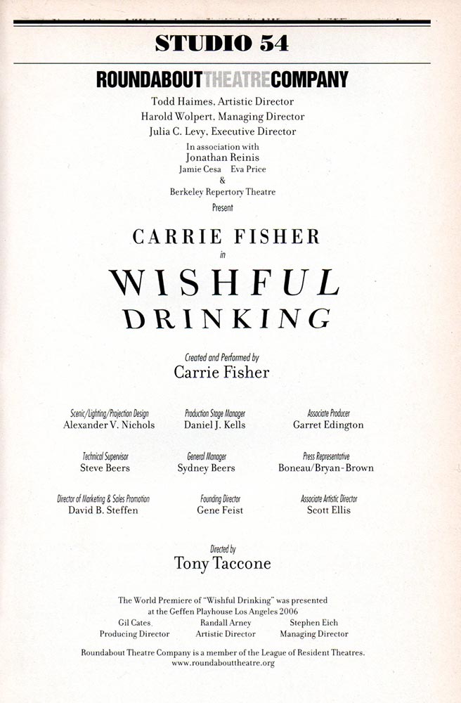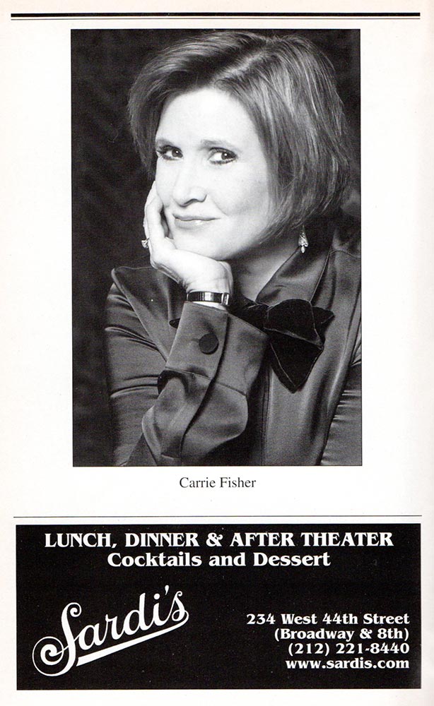 A recorded version of Wishful Drinking is still available on HBO Max, or just plain ol’ Max or whatever that idiot CEO from Discovery has decided to call it by the time you’re reading this post. (A book version is also available, and it’s very enjoyable.) Wishful Drinking ran on Broadway (or—to be honest—way, way off Broadway) for only 133 performances (with 15 previews) from October 4, 2009 through January 17, 2010), so I saw it within the first two weeks of its opening. I’m sure glad I caught it. I miss Carrie Fisher very much.