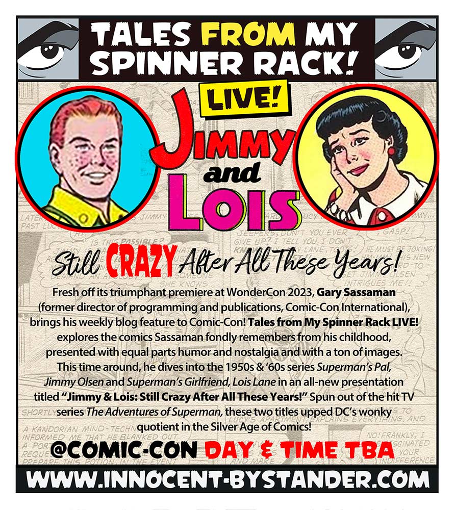 I’m very pleased and excited to announce I will be presenting a panel featuring Tales From My Spinner Rack! at Comic-Con 2023, in just a few short weeks! If you caught my very first appearance at WonderCon back in March, you’ll want to join me for this one, as I cover the two most memorable members of the Superman family of 60 years ago: Jimmy Olsen and Lois Lane! This will be a fun, nostalgic look back at these two incredible titles from an era when comic books were decidedly different, showcased in a PowerPoint presentation featuring covers, story art, and photos from the rollicking 1960s. See Jimmy’s incredible transformations! See Lois’s schemes to find out who Superman really is! See Superman be a dick! I kid you not, these are amongst DC’s wonkiest comic books, drawn by great artists like Curt Swan and Kurt Schaffenberger. It’s a trip down memory lane AND a comics history lesson.