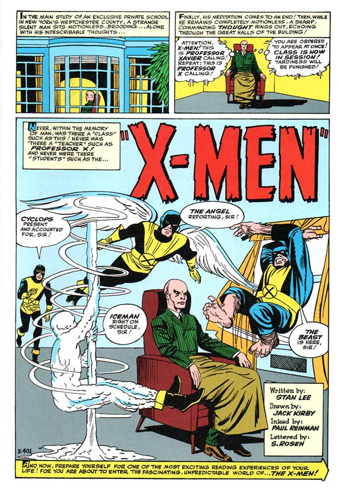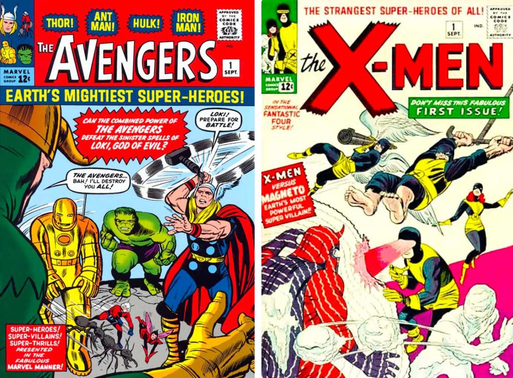 The splash pages of Avengers #1 and X-Men #1, taken from their recent facsimile editions.