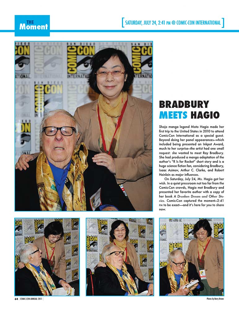 Comic-Con Annual #1 debuted in the first quarter of 2011, just in time for WonderCon that year. This issue included some new features, including a new upfront section called “Splash Page” (see below for an example from issue #2, featuring the most recent Comic-Con Icon Award winner, voice actor June Foray, with an appreciation by Mark Evanier). This section covered some of the pertinent news from Comic-Con’s events, including WonderCon and APE, and a final page called “The Moment,” which for 2010 was the moment shojo manga creator Moto Hagio met Ray Bradbury at Comic-Con. Hagio had requested to meet him, if possible; as it turned out this was his final appearance at the event he loved and had visited, on and off, since the very first con in 1970. Hagio had produced a manga adaptation of Bradbury’s short story, “R Is for Rocket,” and was a huge fan. She gave Bradbury a gift—a autographed copy of her book, A Drunken Dream and Other Stories—and it was just one of those “only at Comic-Con” moments … the kind that inspired this special last page. And for whatever reason, I was just into that evocative Hall H moment from The Expendables panel (middle page above); it seemed like the perfect image for the contents page and publication info.