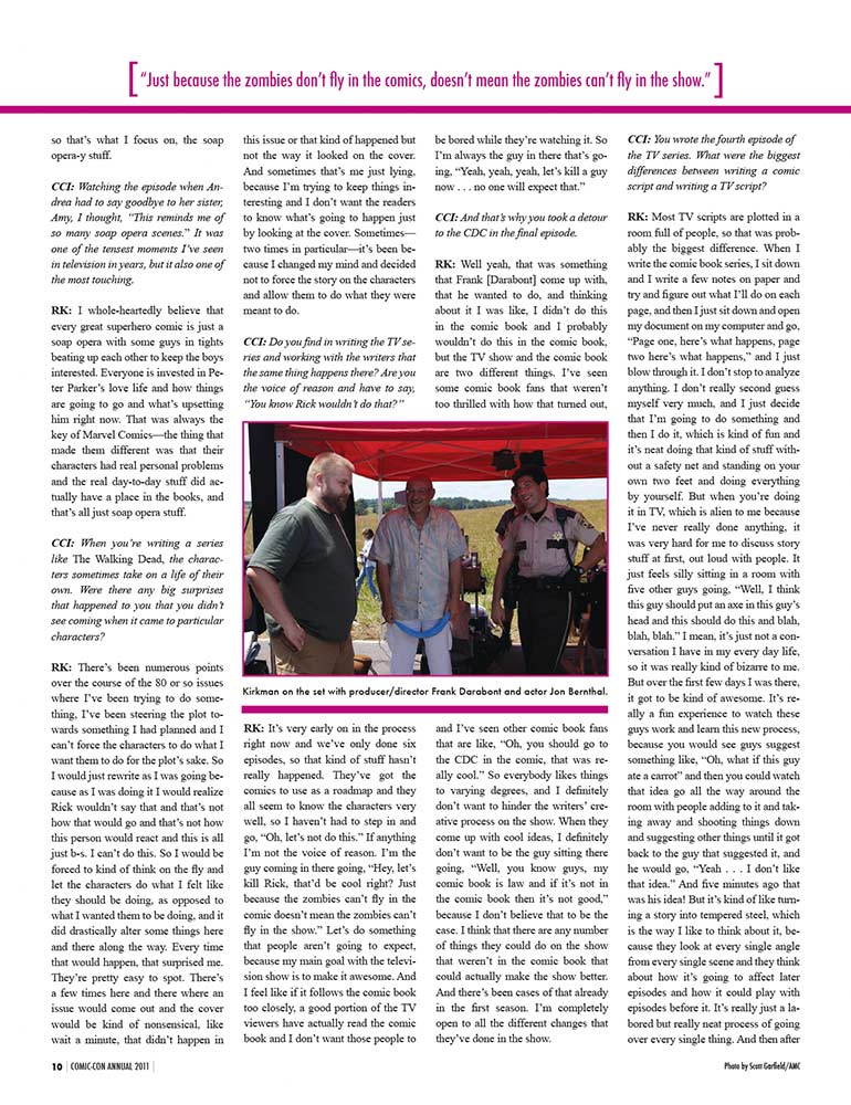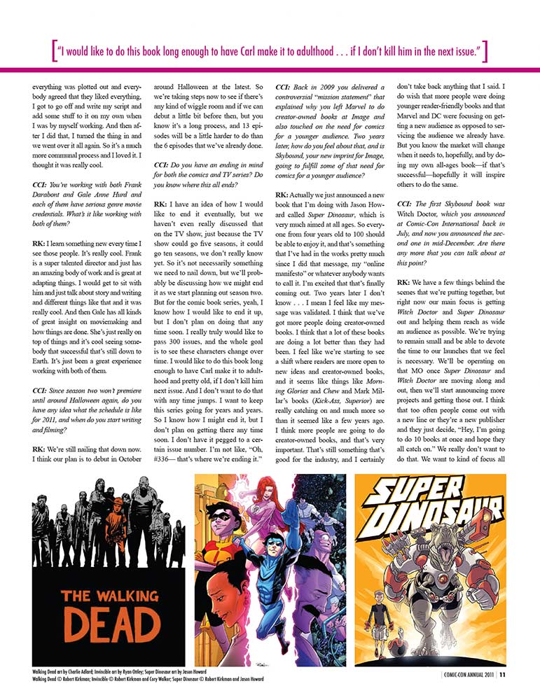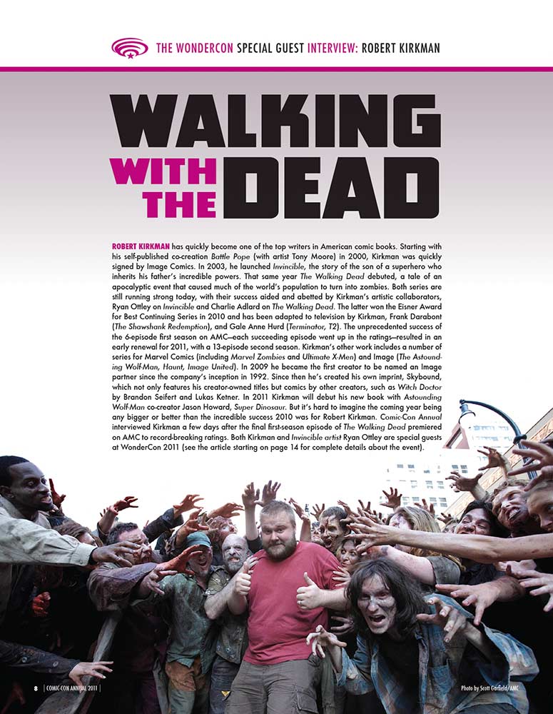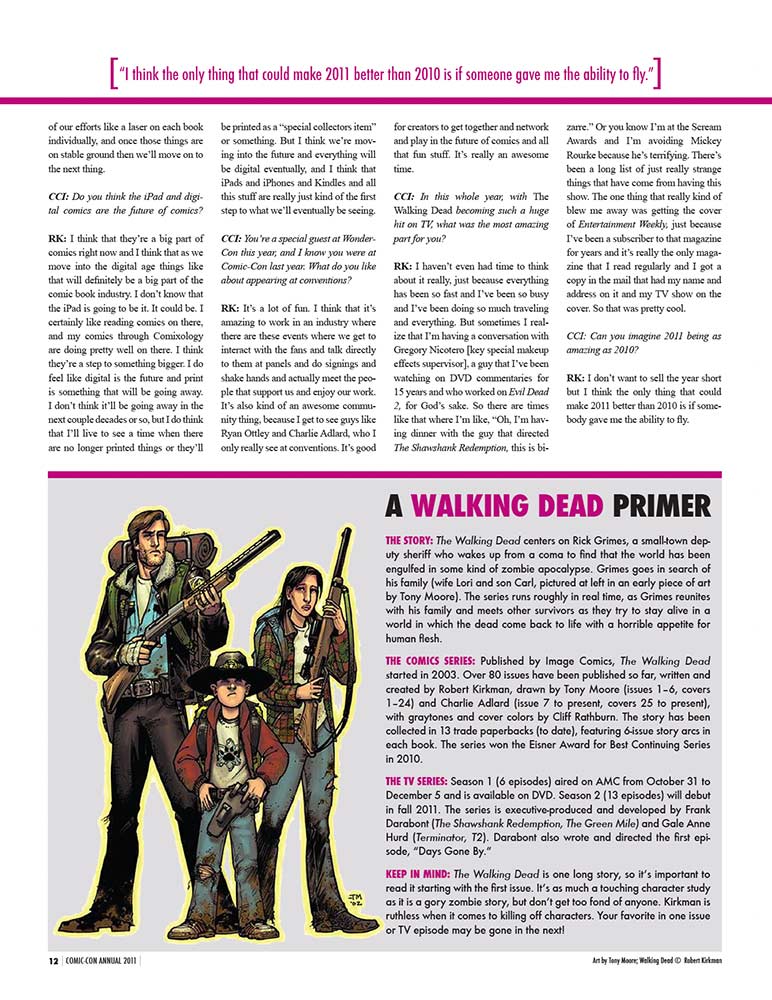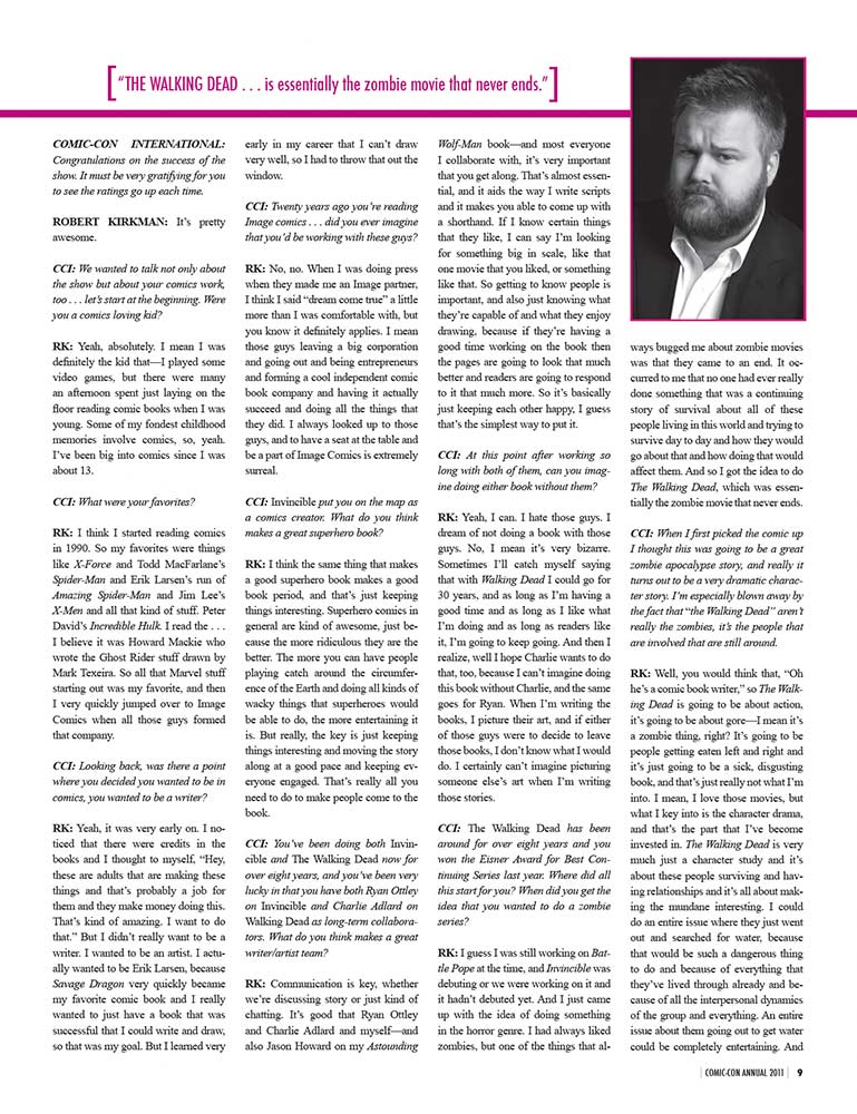 But Robert Kirkman was our “cover boy” (no skunks were harmed in the making of this cover) for this first-ever Comic-Con Annual. He was riding high with The Walking Dead TV series on AMC, based on his comic book series from Image/Skybound. It had just debuted and I was able to conduct a long interview with him, which was the cover story for this issue. Kirkman was a special guest at WonderCon and it was a year when the press people at Comic-Con got copies of the Annual placed in free newspaper and magazine machines all over downtown San Francisco. I remember talking to Kirkman at the show and he remarked how weird it was to be walking over to Moscone Center from his hotel and seeing his face staring back at him every few blocks.