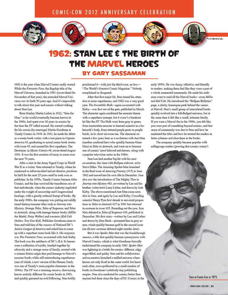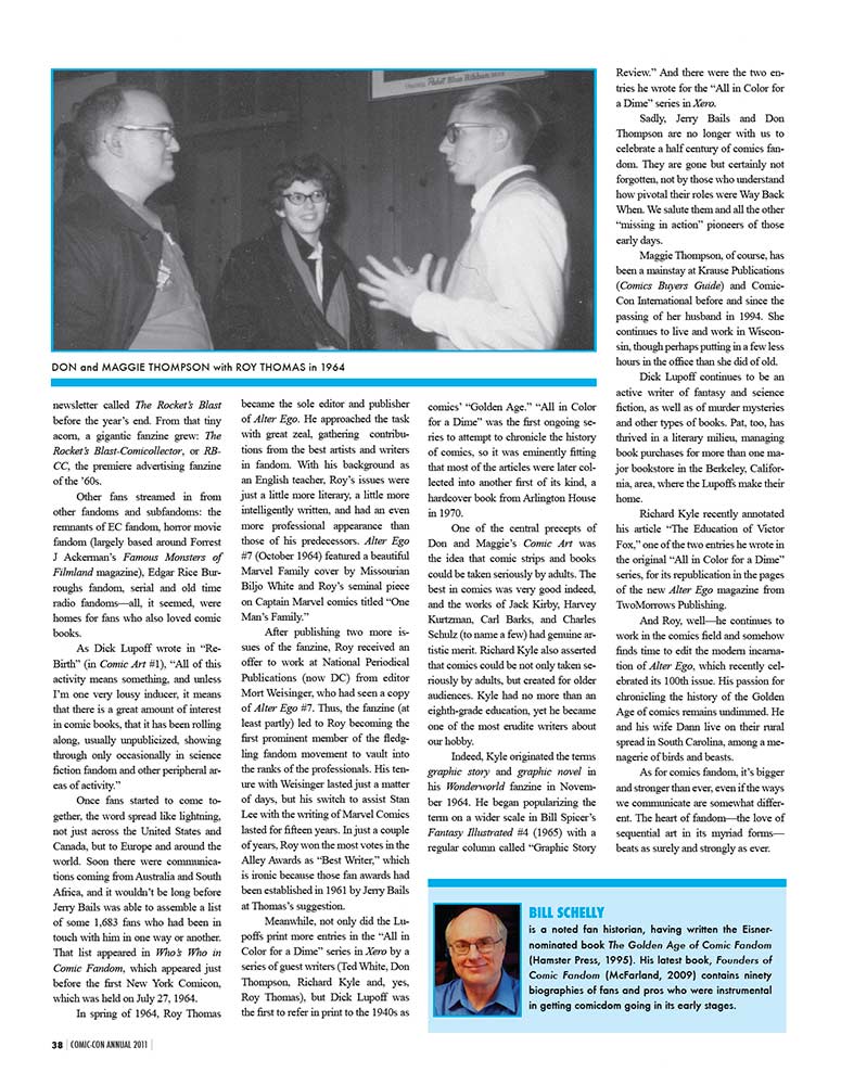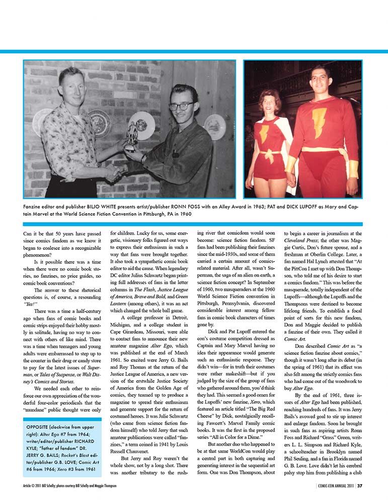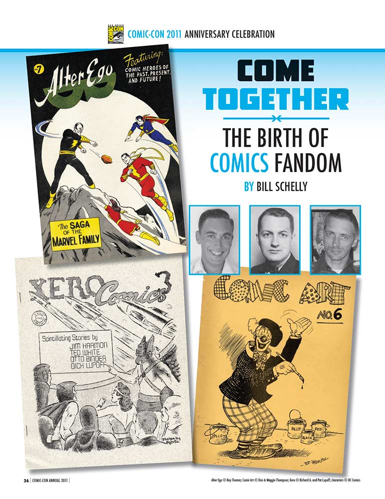 Comic-Con Annual afforded me a few more pages to stretch out and do some special things. We did three articles that tied into special events and anniversaries we had planned for Comic-Con 2011, including the 50th anniversary of the birth of comics fandom. I relied on my friend Bill Schelly, THE expert on fandom, to do a short article. Comic-Con pulled out all the stops for this event, inviting numerous guests that were instrumental in the beginning years, including Roy Thomas, Maggie Thompson, Richard and Pat Lupoff, and Richard Kyle, and threw a Saturday night party for everyone involved. Schelly went on to write the definitive book on MAD creator Harvey Kurtzman, and a biography on James Warren, another comics giant. Schelly died in 2019 and I still miss working with him; the final major article he worked on was for me: A history of Comic-Con for the 2019 Souvenir Book celebrating the 50th anniversary of Comic-Con. This first annual also included articles on the 50th anniversary of the Fantastic Four and the 25th anniversary of “1986: The Year Comics Grew Up” (with the publication of Watchmen, Maus, and Batman: The Dark Knight Returns).