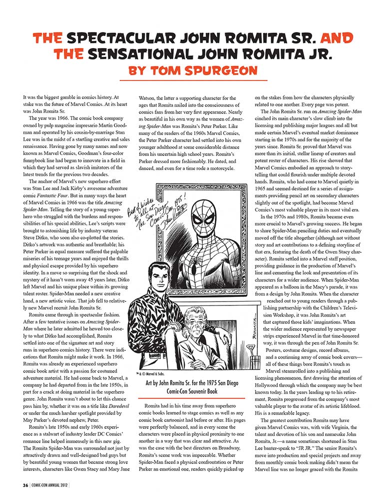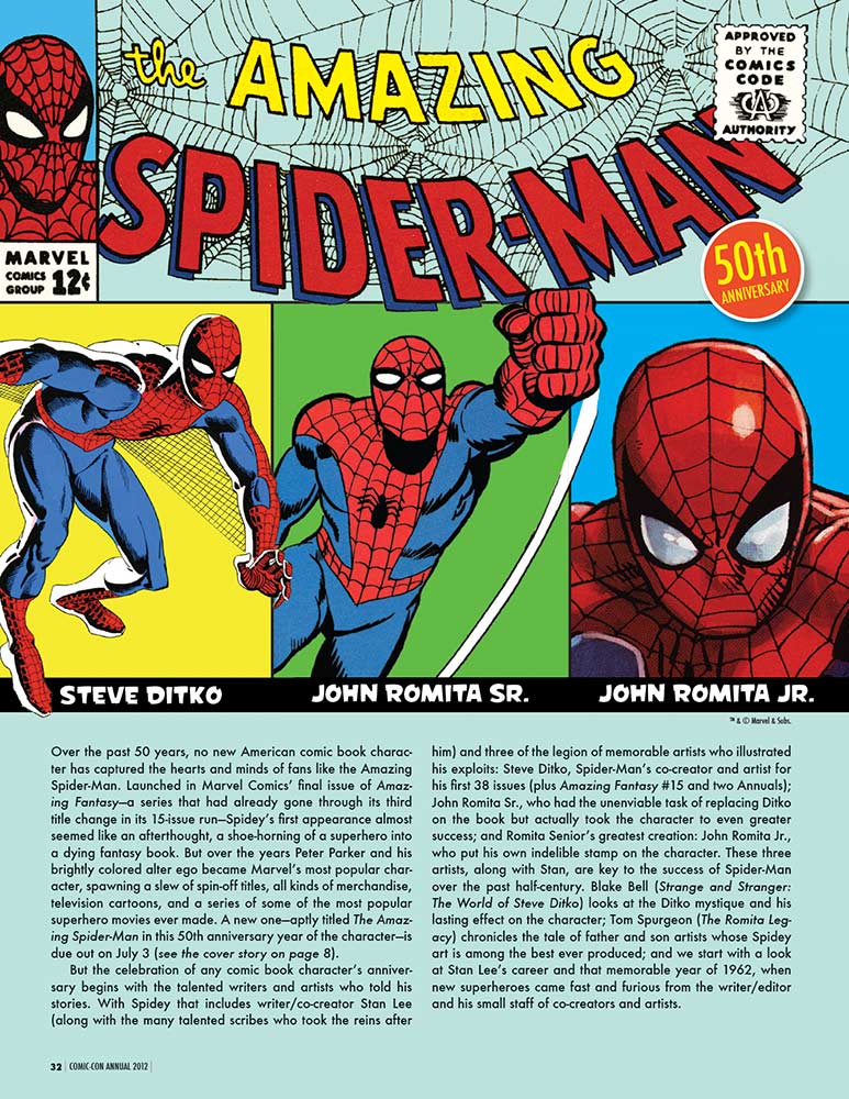 The Spider-Man movie reboot coincided with the 50th anniversary of the creation of Spider-Man by Stan Lee and Steve Ditko, along with the other superheroes who ushered in the Marvel Age of Comics in 1962. This issue featured three articles, including one on Steve Ditko by Blake Bell, and one on the legacy of John Romita and his son, John Romita Jr., the other most famous Spidey artists. I contributed an article on Stan the Man himself, which also touched on what he brought to the Marvel table and the creation of Hulk, Ant-Man, Thor, and Iron Man. In actuality, I wrote a lot of articles for these publications; I just seldom gave myself a written credit. Most of the upfront material was written by me, I conducted all of the interviews, and wrote all the promotional copy for the shows (with the exception of the special guest bios, which were provided by the guests themselves). Comic-Con Annual #2 also featured articles on the 75th anniversary of Prince Valiant and the 40th anniversary of Love and Rockets.