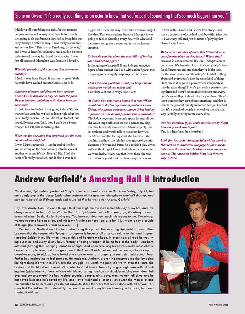 The cover feature for Comic-Con Annual #2, the final mailed magazine, was the movie reboot of Spider-Man from Sony Pictures, starring Andrew Garfield and Emma Stone. They had both appeared at Comic-Con 2011 and were scheduled to appear at WonderCon 2012 (that event’s final show in San Francisco) and I got permission from Sony to interview both director Marc Webb and—be still my beating heart—Emma Stone. I remember talking to Stone for about 20 minutes or so right before Christmas 2011 and she was funny, honest, and engaging, even if we were “chaperoned” by a publicist who kept counting down the minutes left before Emma had to go fry bigger fish, publicity-wise.
