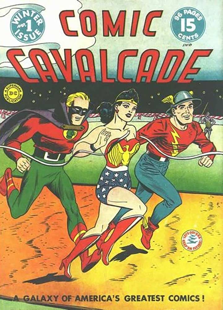 The larger format annual was created by DC for the New York World’s Fair and continued after as a regular, quarterly book, ultimately titled World’s Finest. DC’s sister company, All-American Comics, also got into the act with The Big All-American Comic Book in 1944 and the ongoing Comic Cavalcade, which featured 96 pages for 15 cents. TM & © DC.