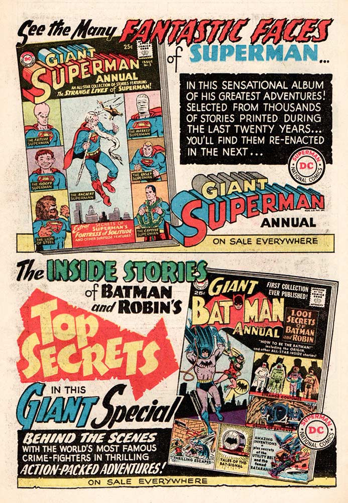 Only that very first Giant Superman Annual was actually an annual; issues #2 through 8 came out twice a year, one in the summer and one around the holidays. By 1964, there were eight Superman issues published, and then DC took their annuals—which by then included Batman, Lois Lane, Flash, Secret Origins, and Sgt. Rock—and folded it into a separate series called 80-Page Giant; the first three issues (published in 1964) featured Superman (#1), Jimmy Olsen (#2), and Lois Lane (#3). That lasted for 15 issues, before the 80-Page Giants were again folded into the regular numbering of each series it was reprinting.