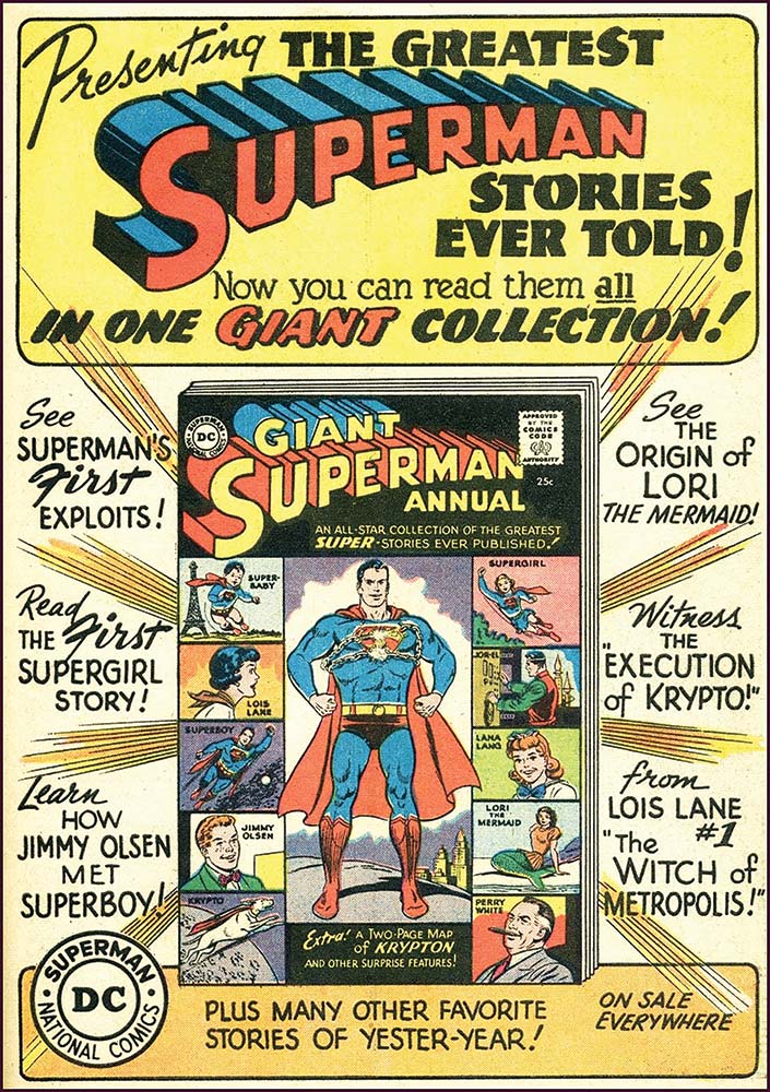 But it was DC Comics that jumped into the fray in 1960 with their Giant Superman Annual #1, which was published on June 23 of that year. Cover-billed as “An All-Star Collection of the Greatest SUPER-stories Ever Published!”, the truth of the matter is this was a pretty lackluster collection, dating back only a few years in its choice of reprint material. New material in the form of special features was limited to a half-page flag of Krypton, a two-page spread Map of Krypton, a three-strip reproduction of Superman daily comic strips (in black and white on the inside back cover), and a look back at “Famous First Issues!” on the back cover, showcasing the covers of Superman #1, Superboy #1, Superman’s Pal Jimmy Olsen #1, and Superman’s Girl Friend Lois Lane #1 … “Save these souvenir covers!” proclaimed the cover text, along with the original publication dates of each book.