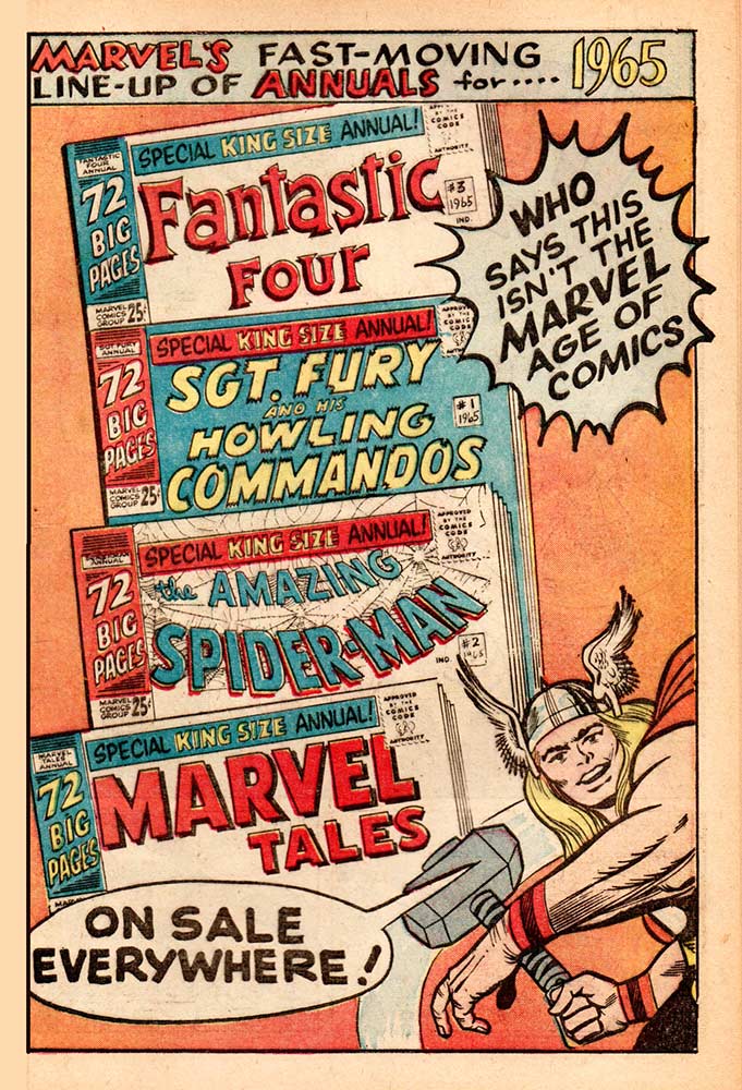 Marvel released six annuals in the summer of 1965, but the amount of new features went down precipitously. All their superhero annuals included just one new story, ranging in size from 15 to 23 pages—about the size of a regular full issue—and special features were kept to a minimum. This year’s crop of publications was called “Special King Size Annual” across the top of the book and the usual, world-famous Marvel Comics corner boxes, previously based on the regular titles’ ones on the annuals, instead heralded “72 Big Pages,” as a reminder of the special-ness of these special annuals, king size, no less.