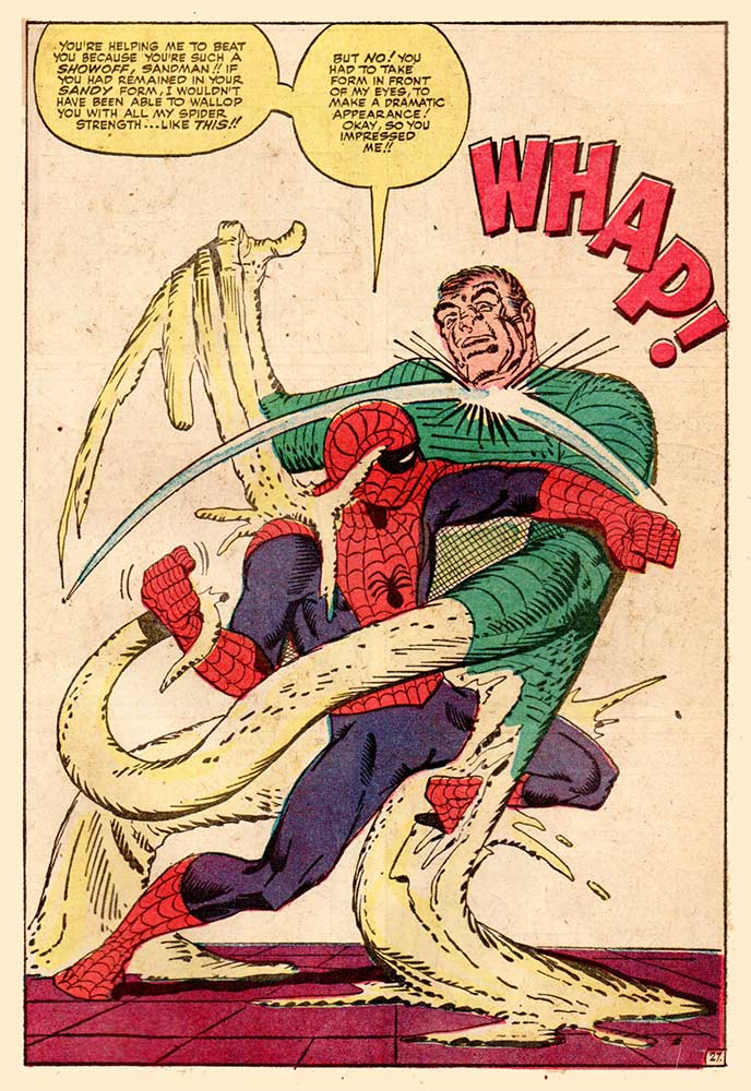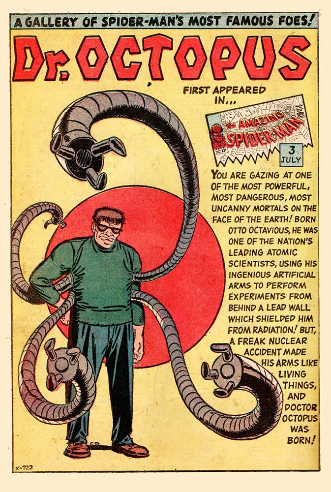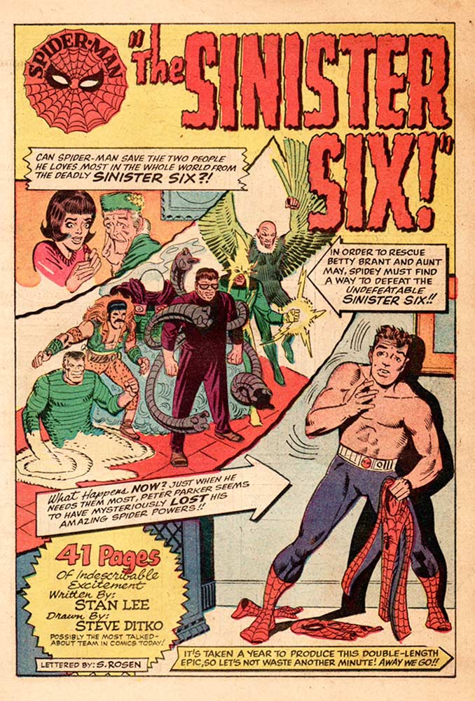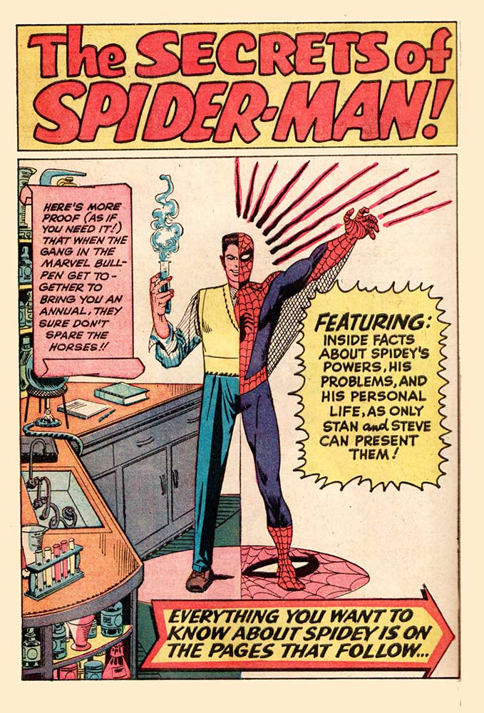 That summer, Marvel released four annuals. The first one out of the gate was Amazing Spider-Man Annual #1 (released on June 11, 1964, between Spidey’s regular title #s 16 and 17). It’s Marvel’s first all-new annual (superhero division), featuring a 41-page lead story “The Sinister Six,” which teams up six of the ol’ Webhead’s most, um … sinister, I guess, foes (Dr. Octopus, Electro, Kraven, Mysterio, Sandman, and Vulture) in a bravura tale from Stan Lee and Steve Ditko (emphasis added on the latter, please). Ditko’s incredible art included six full-page “money-shots” of Spidey fighting each of the villains. In addition to this giant story, this book also contained a 14-page “Gallery of Spider-Man’s Most Famous Foes,” covering all the baddies from Amazing Fantasy #15 (“The Burglar”) through Amazing Spider-Man #15 (“Kraven the Hunter”); a 9-page “Secrets of Spider-Man” feature; five pages of pin-ups; and a 3-page “How Stan Lee and Steve Ditko Create Spider-Man!,” in which Stan and Steve—apparently still getting along at this point—poke fun at each other.
