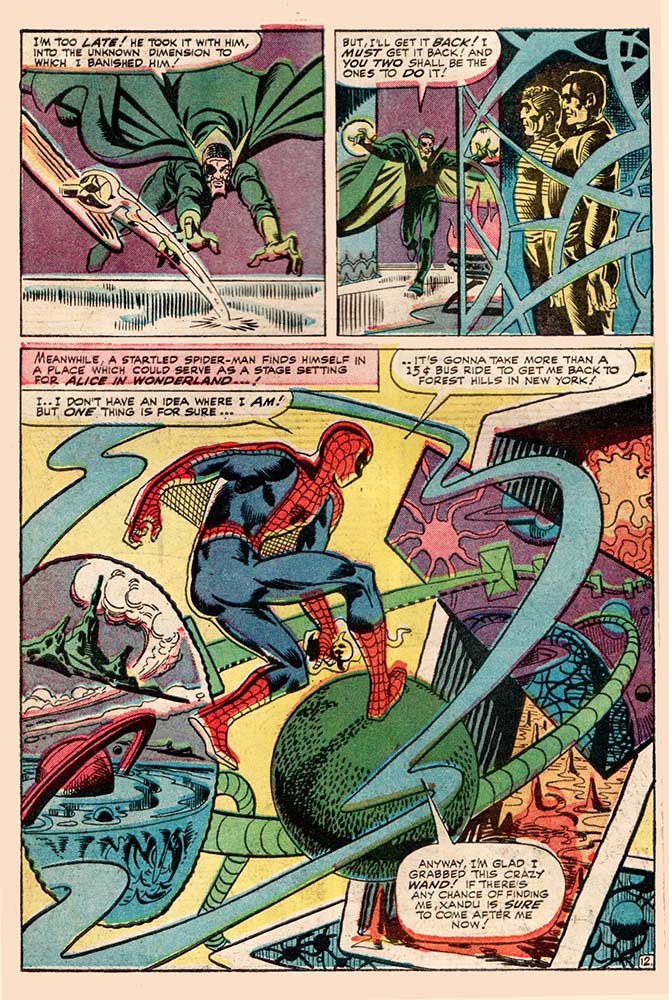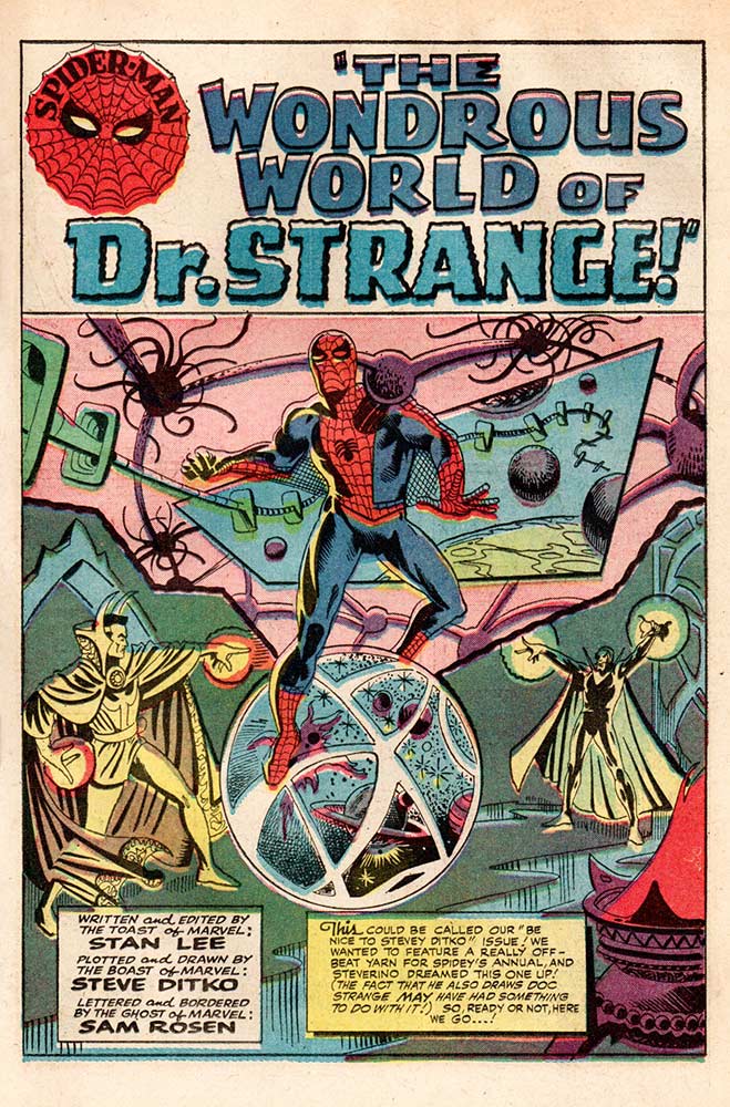 First on the newsstands in 1965 was the Amazing Spider-Man Special King Size Annual #2 (released on June 1, 1965, between ASM #28 and 29), featuring the 20-page story, “The Wondrous World of Doctor Strange” plotted and drawn by Steve Ditko (with script and editing by Stan Lee), and it was indeed wondrous, especially Ditko’s art. It also featured 5 more pages of the“Gallery of Spider-Man’s Most Famous Foes,” featuring the villains from ASM issues #16 through 26. There were more pages devoted to reprints, a sad occurrence across the 1965 Annuals. This one included the first story from ASM #1 and the second story from ASM #2 (“The Uncanny Threat of the Terrible Tinkerer”), and all of ASM #5, when Spidey first met Doctor Doom.