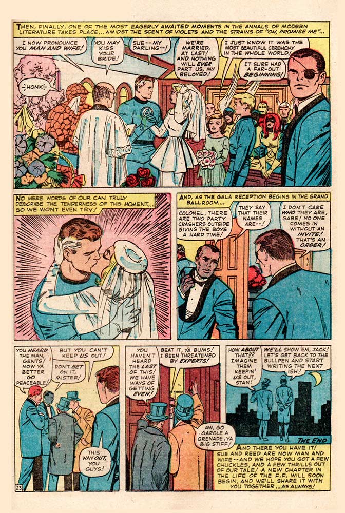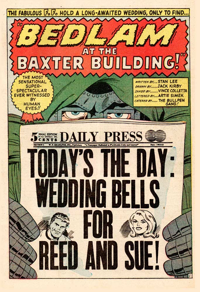 Fantastic Four Special King Size Annual #3 was up next (released on July 1, 1965, between FF #43 and 44). This issues featured the legendary wedding of Reed Richards and Sue Storm in a 23-page story titled “Bedlam at the Baxter Building,” by Stan Lee and Jack Kirby, with inks by Vince Colletta (this, thankfully, would be the last of Colletta’s inks on FF, with the amazing Joe Sinnott coming on board for FF #44 and staying pretty much throughout the remainder of Kirby’s run, close to 60 issues). It also featured reprints of the complete stories from FF #6 (the Sub-Mariner/Doctor Doom team-up and #11 (“A Day in the Life of the Fantastic Four” and the introduction of the Impossible Man). Sadly, there were no other special features.