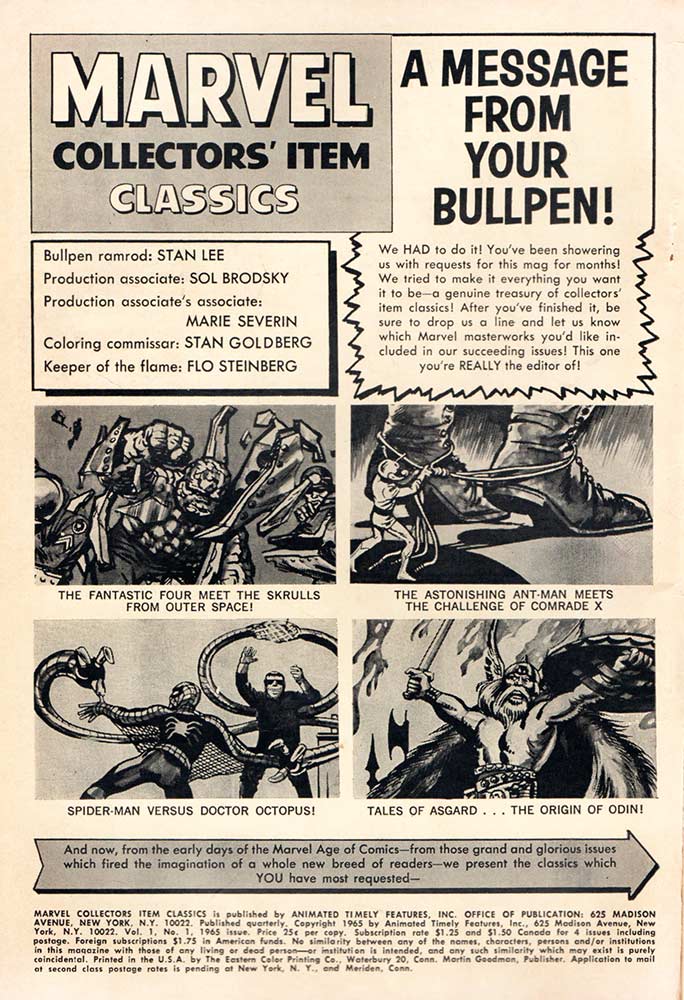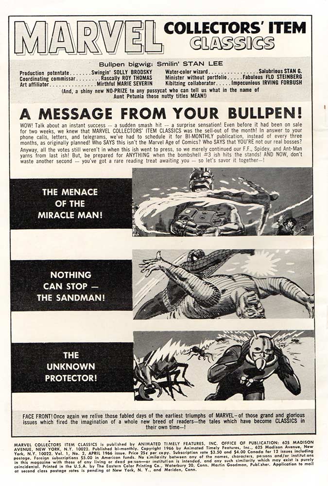 The success of the Marvel Tales Annuals undoubtedly inspired the creation of Marvel Collectors’ Item Classics, which debuted later in 1965 after “Annual Season” had ended. Another 25-center, it was published on October 5 and was followed three months later by issue #2 on January 4, 1966. It was billed as a “King-Size Bullpen Book,” and while those first two issues included “1965” and “1966” boxes on their respective covers, this was not another Annual; it was the start of a regularly-scheduled (bi-monthly) reprint book. MCIC lasted 22 issues, and then was retitled as Marvel’s Greatest Comics, which lasted an additional 74 issues. At Marvel, sometimes it may look like an Annual and feel like an Annual, but it really isn’t an Annual. One thing, though: They added a spiffy inside front cover gray-tone introduction page, which would carry over into all the Marvel Annuals in 1966, 1967, and 1968.