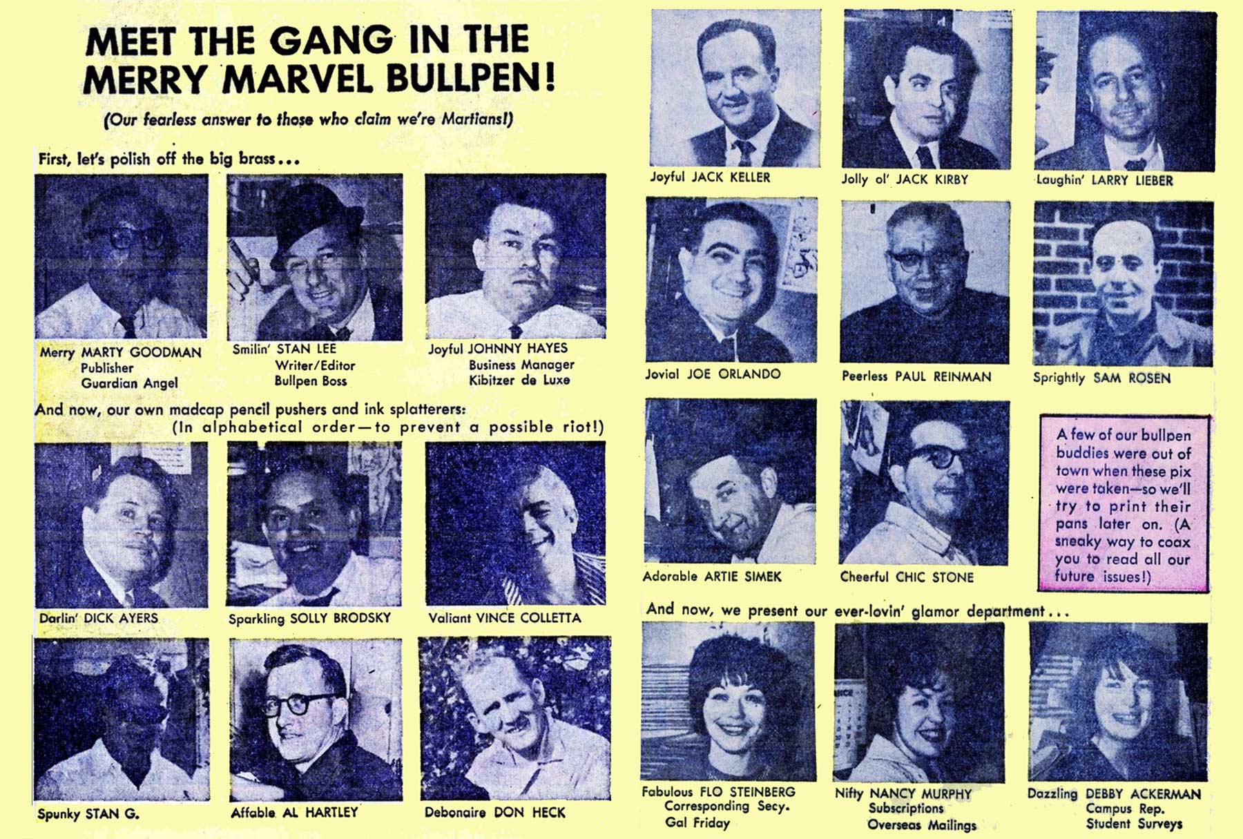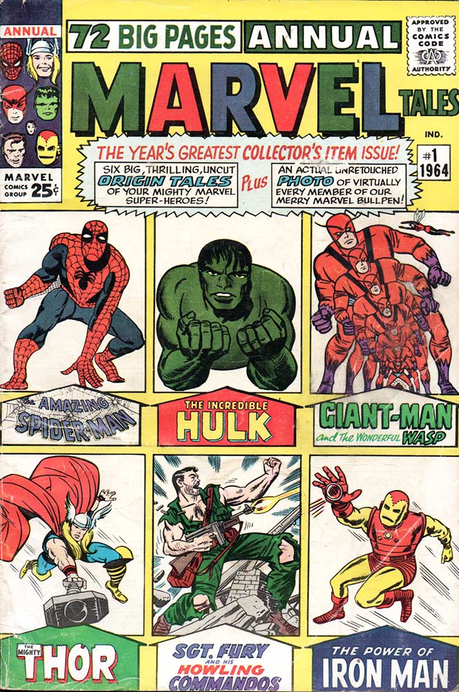 The first Spidey Annual was followed by the first Marvel Tales Annual #1 (released also on June 11, 1964), an all-reprint affair, thus starting Marvel’s love affair with reprinting its past. To be fair, this was a good thing; with spotty newsstand-only distribution, many of the early Marvel titles didn’t make it into the hands of fans, and Stan and company quickly learned there was a market for such reprints. Marvel Tales Annual #1 contained origin tales of Spidey (from Amazing Fantasy #15); the first chapter from The Incredible Hulk #1, recounting his gamma bomb origin; “The Return of Ant-Man” (from Tales to Astonish #35), Hank Pym’s origin story as a superhero, along with two pages from Tales to Astonish #49, in which Ant-Man became Giant-Man; the first six pages from Sgt. Fury and His Howling Commandos #1, introducing the squad; the origin of Iron Man from the first story in Tales of Suspense #39, plus four pages from ToS #48, revealing the creation of Iron Man’s new costume; the complete origin of Thor from Journey Into Mystery #83; and finally—the moment we were all waiting for—a two-page spread of photos of the members of the fabled Marvel Comics Bullpen!