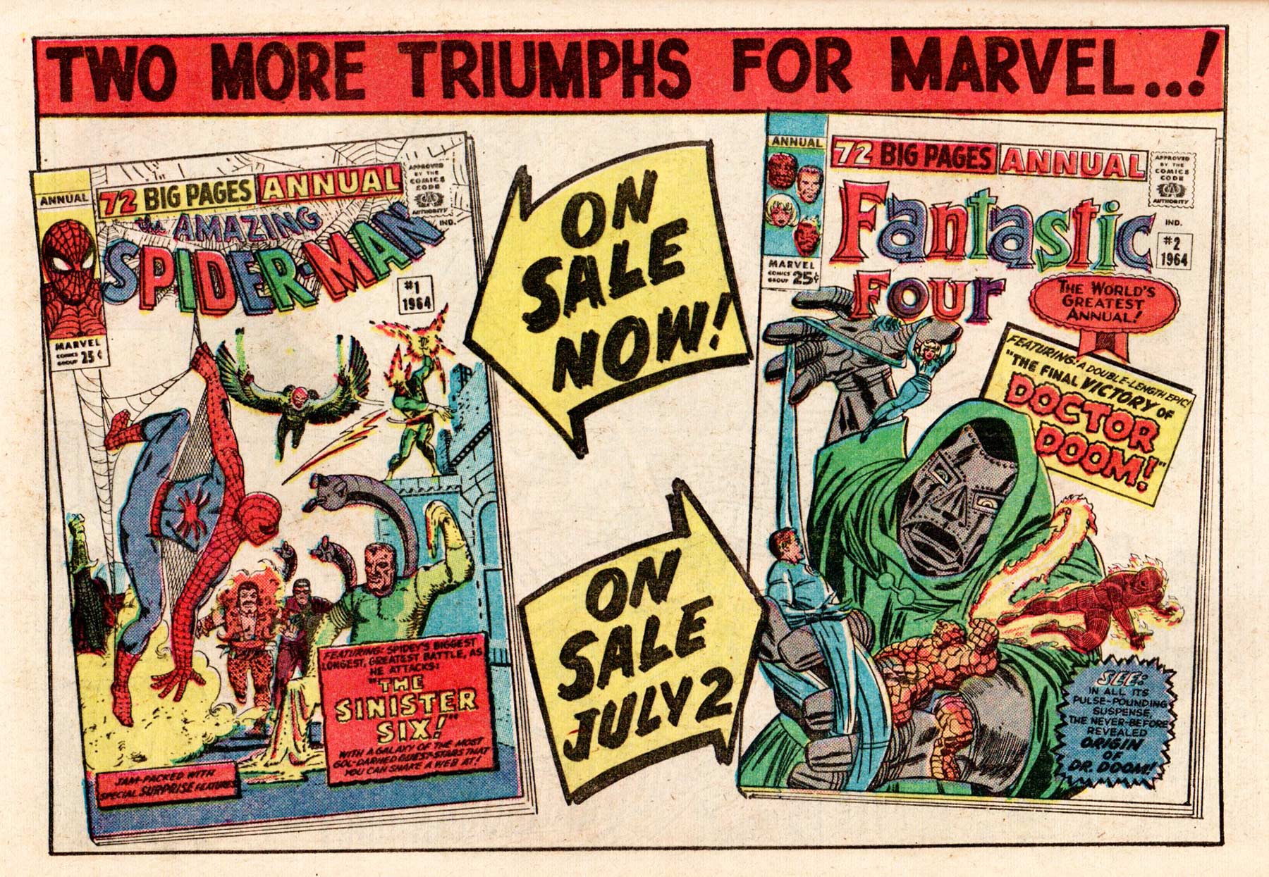 Marvel’s other two 1964 annuals debuted on July 2: Millie the Model Annual #3 and Fantastic Four Annual #2. Millie #3 was most likely an all-reprint affair, while FF Annual #2 included a 12-page new story, “The Fantastic Origin of Doctor Doom,” which opened the book; six pages of “Gallery of Famous Foes,” covering the bad guys from FF issues #18-30; five pin-ups (Mr. Fantastic, Sue Storm, Human Torch, Thing, Alicia Masters); and to close the book, a 25-page story, “The Final Victory of Dr. Doom.” Sandwiched in the middle of the annual was a reprint of FF #5, the very first Doctor Doom tale (you know, the one with pirates!). The new stories—once again totaling 37 pages, like FF Annual #1—were by Stan Lee and Jack Kirby, with inks by Chic Stone. This second FF Annual was a little bit of a letdown—for me, at least—as it didn’t have as many special feature pages as the first one, but it sure was a sight to behold on my local newsstand in the middle of summer 1964.