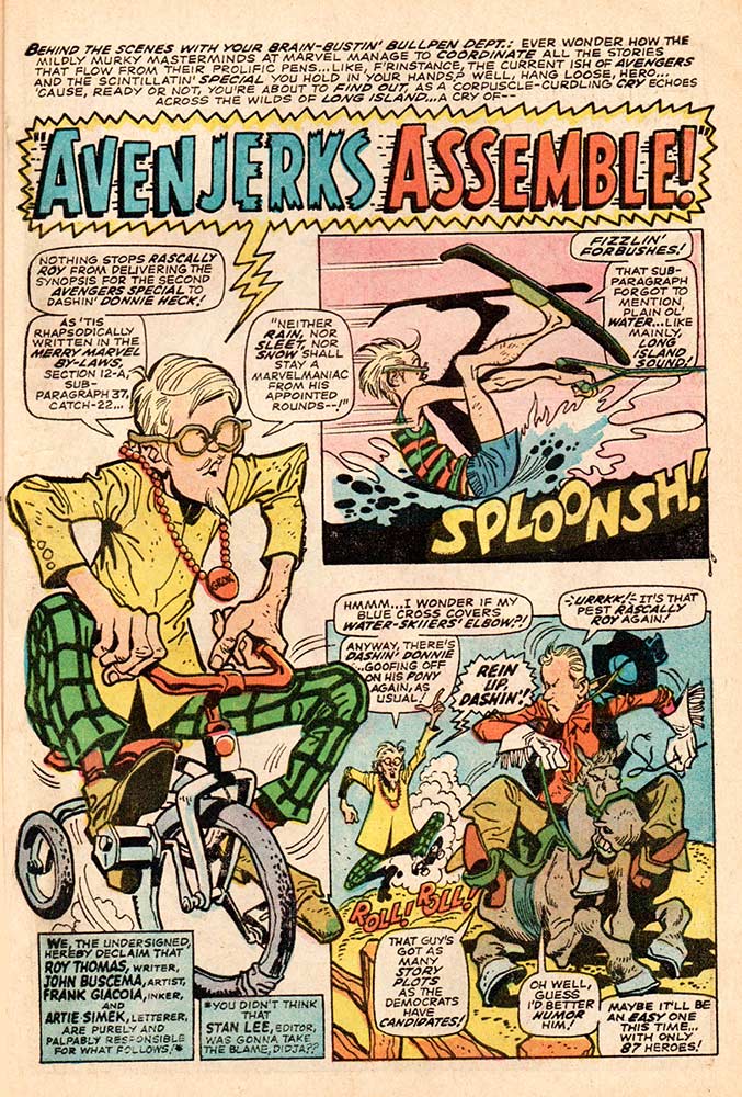 July 8 saw the release of Avengers King-Size Special #2 (between Avengers #56 and 57), featuring a 44-page story, “… And Time, the Rushing River …” by Roy Thomas, Don Heck, Werner Roth, and Vince Colletta, with a stunning two-page pin-up of the current Avengers team by John Buscema, who was the regular title’s penciller. This was one of those “new Avengers meet old Avengers” team-ups, featuring yet another time-spanning villain, The Scarlet Centurion, who may or may not be Doctor Doom, Kang, or Rama-Tut. Buscema also provided the great cover, one of a series by him over the years for Marvel, showcasing dynamic figure work with characters battling each other (see also Fantastic Four #112 and Sub-Mariner #8) drawn simply over a solid black background. Yet another (sigh) “funny” behind-the-scenes five-page story, “Avenjerks Assemble!”, was by Roy Thomas, Buscema, and inker Frank Giacoia.