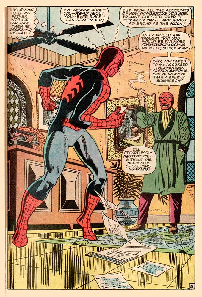 Finally, on August 13, the “Big Two” once again made their annual appearances, with the release of Amazing Spider-Man King-Size Special #5 (between issues #62 and 63) and Fantastic Four King-Size Special #6 (on the same day as FF issue #80). The Spidey Annual featured the long-awaited introduction of Peter Parker’s long-dead parents, revealed in a flashback story to be spies working for the U.S. government, and infiltrating the Red Skull’s criminal organization. It’s a story written by Stan Lee and drawn by Larry Lieber (with inks by Mike Esposito) and featuring “Jazzy Johnny Romita, Chaotic Consultant,” which is ill-informed at worst (the Red Skull was in suspended animation during the timespan of this tale, according to the Captain America feature over in Tales of Suspense), well-meaning at best, to at least give us an idea of who Spidey’s parents were. There’s also six pages of pin-ups and a three-page—you guessed it—humorous story, “Here We Go A-Plotting!”.