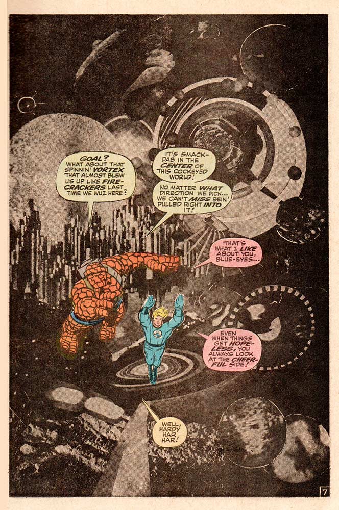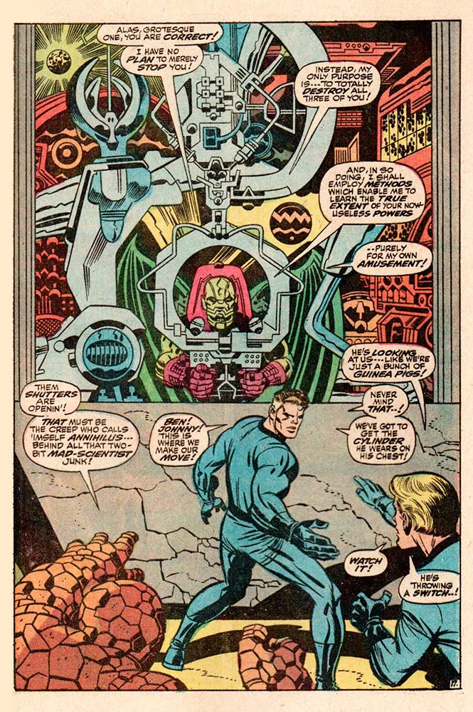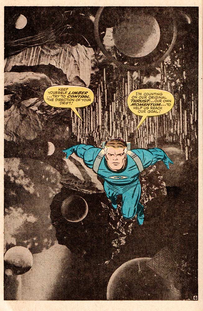 The final Marvel Annual of 1968—Fantastic Four King-Size Special #6—is the best, an absolute classic story of the team that launched Marvel Comics seven years earlier. It’s the one were Sue Storm gives birth to her son with Reed Richards. It is, I think, Jack Kirby’s last great FF story, one created during the artist’s period of soul-searching as to what his future in comics was to be. It includes Kirby’s last great FF villain, Annihilus, “The Living Death That Walks,” and the scourge of the Negative Zone, where Reed, Thing, and Human Torch travel to procure the “Cosmic Control Rod” to save Sue’s life during childbirth. It’s 48 pages of pure perfection, with no fewer than seven splash pages, amidst lots of pages with big panels, all gloriously inked by Joe Sinnott. It even includes a two-page Kirby collage. I was never a fan of these “experiments” by King Kirby, but in retrospect I think it’s because the printing technology of the time for comic books just wasn’t there to make these things look as good as they should have. If it was done nowadays, I’m reasonably sure they’d absolutely sing and appear the way Kirby wanted them to. There are no special features in this Annual … just “A spectacular movie-length epic complete in this collectors-item issue!”, a bit of “Way-out wonderment as none but Stan “The Man” Lee and Jack “King” Kirby could create it!” Yes, it truly was the Hyperbolic Age of Stan Lee. In an interesting side-note, I just learned a couple of weeks ago—via Tom Brevoort’s weekly newsletter—that the cover to this Annual was inked by Wally Wood. If you zoom in on Reed’s face, you can see it.