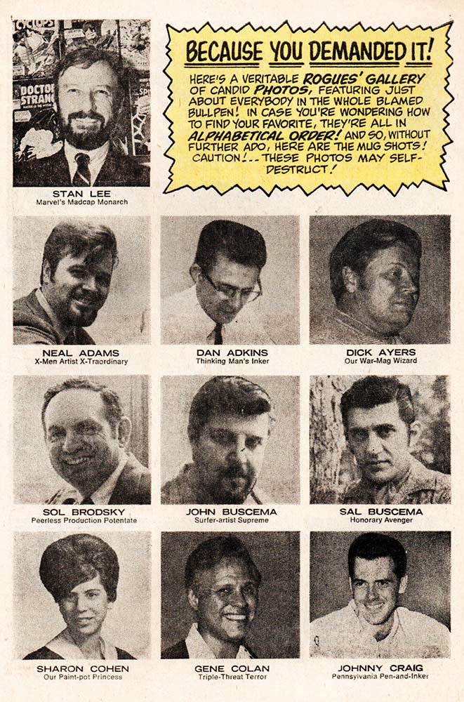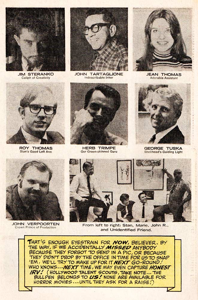 Fantastic Four King-Size Special #7, released on August 5, 1969, between FF issues #91 and 92, features the last Kirby cover for the 1960s FF Annuals. It reprints the first story from Fantastic Four #1 featuring the Mole Man, and the two Doctor Doom stories from FF Annual #2. But it’s most notable for including yet another Bullpen photo feature, this time a four-pager featuring just about everyone working for Marvel in 1969. It shows how much the company has grown in the five short years since the original Bullpen photo feature in Marvel Tales Annual #1 back in 1964. And it’s kind of a nice bookend to the whole Marvel Annuals saga.