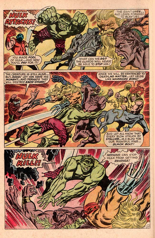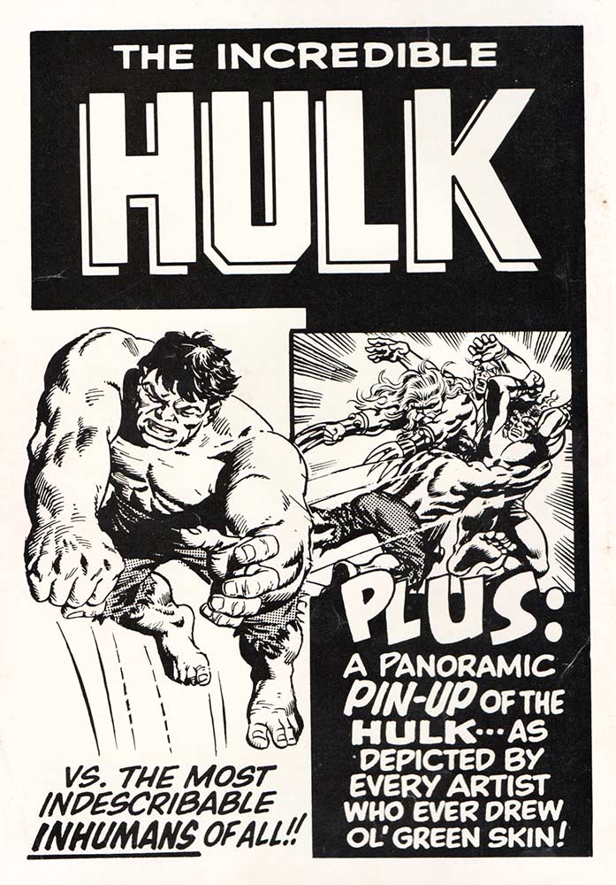 The Incredible Hulk King-Size Special #1 was released a week later, on July 16, 1968, smack-dab between Incredible Hulk #108 and 109. Clocking in at a mammoth 51 pages, this behemoth of a story was written by Gary Friedrich and drawn by Marie Severin and Syd Shores, and features the Hulk vs. the Inhumans, only it’s a pretty different cast of Inhumans, except for Black Bolt, Gorgon, and Maximus. Much as I love seeing this much work by Marie Severin in any one place, this is a talky, way-too-long story, highlighted only by Hulk taking on Lockjaw for a page or so, and yelling “HULK ATTACK!!!” and “HULK KILL!!!” on a single page (“You wouldn’t like me when I’m angry”). I’m not sure I’d ever seen “Hulk Kill” before or since, but the last new Hulk book I read was probably in the early 2000s. And let’s face it: If Hulk had a dog, it would have to be Lockjaw, so can’t they just get along? This Annual is also famous for its Jim Steranko cover, altered a bit before publication, but still amazing. It may just be the best thing about this issue, along with that pretty spiffy past-up job showcasing all the Hulk artists that had come before, the only special feature in the book (and one that was surgically removed from my copy, unfortunately).