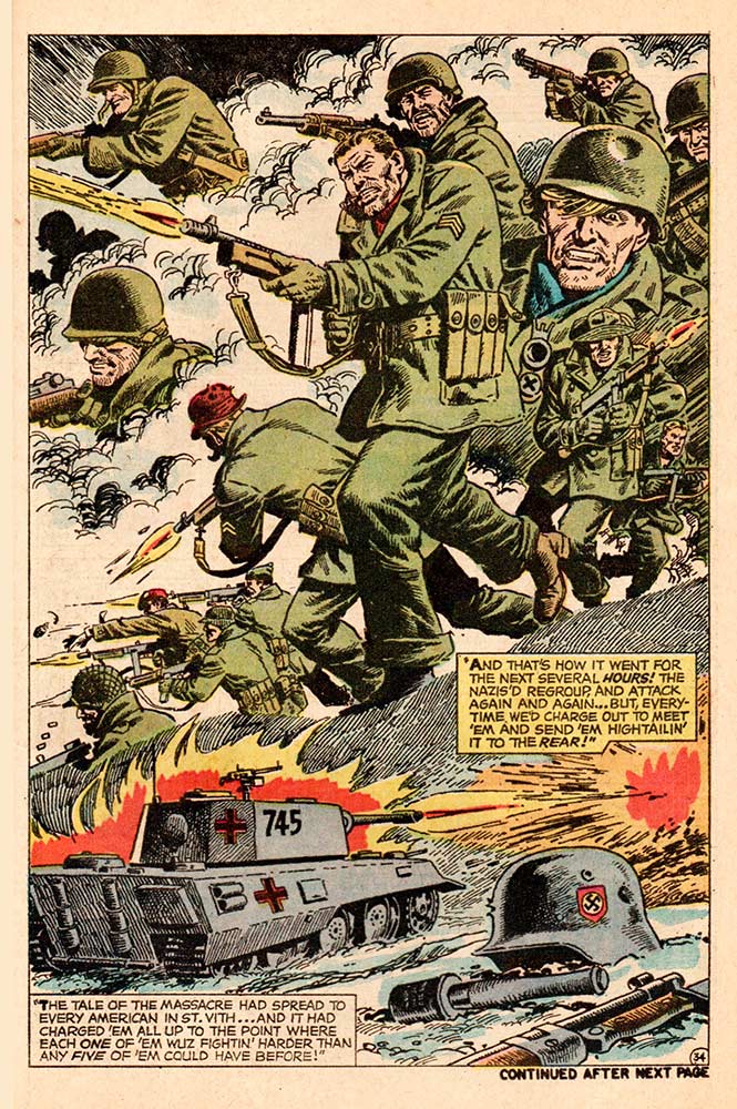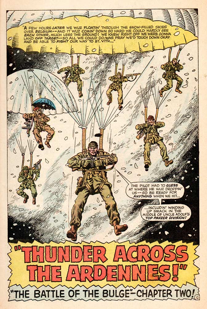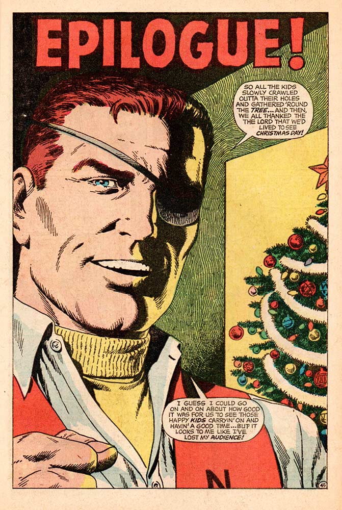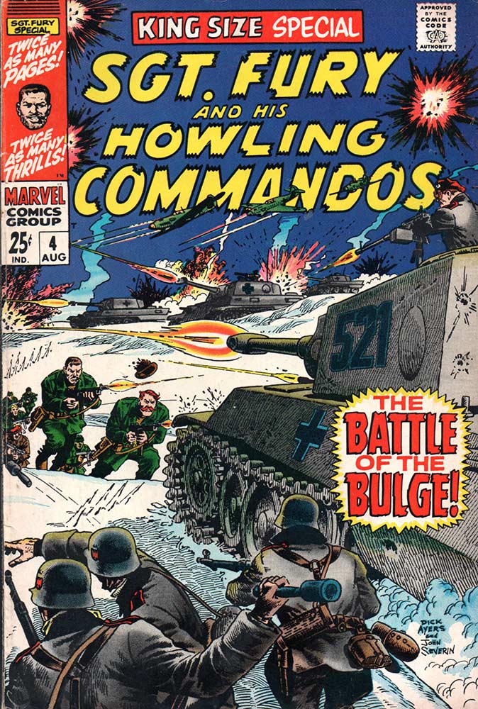 1968’s Annual Season started, as usual, with Millie the Model and Sgt. Fury and His Howling Commandos (this happened on such a regular basis, I’m starting to think that Millie and Nick had something going on, if you know what I mean). Both The New MmmMillie the Model Queen-Size Special #7 and Sgt. Fury and His Howling Commandos King-Size Special #4 were released on June 11. The Fury Special appeared between issues #45 and 46 of the regular title. John Severin had just joined the Howlers as first penciller/inker, then inker with issue #44, and his gritty, detailed inking style certainly added to Dick Ayers’s pencils. This Annual featured one 47-page story, “The Battle of the Bulge,” focusing on the Christmas 1944 campaign that was the Nazi’s last stand in World War II. Written by Gary Friedrich and drawn by Dick Ayers and John Severin, the story was book-ended by modern-day pages featuring Fury and some of the Howlers reuniting and reminiscing at a holiday celebration about this last huge battle. There was also a three-page “Gary and Dick Up Front” story, featuring a look at the duo creating a Fury story, ala Marvel’s Not Brand Echh humorous title.