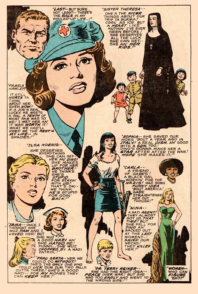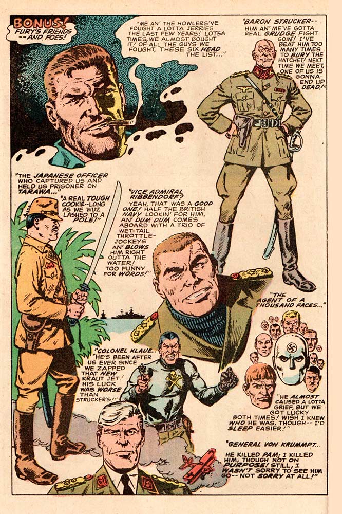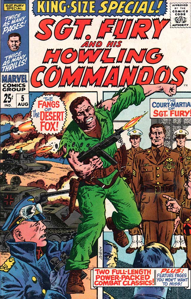 Sgt. Fury and His Howling Commandos King-Size Special #5 reprints Sgt. Fury #6 (“The Fangs of the Desert Fox!”) and #7 (The Court-Martial of Sgt. Fury!”), but it sure looks like someone at Marvel may have conceived this as a new Annual. Released on June 17, 1969, between Fury issues #57 and 58, this Annual contains seven pages of special material, including a four-page recap of “Fury’s Friends and Foes,” drawn by Dick Ayers and John Severin, and more than likely written by Gary Friedrich, the regular series writer at the time. There’s also a four-page “Weapons of War” feature, which may or may not be reprint material. I know the guns page is from an early Jack Kirby issue of Sgt. Fury; I’m not sure about the pages that focus on tanks and planes, which appear to be the work of Severin.