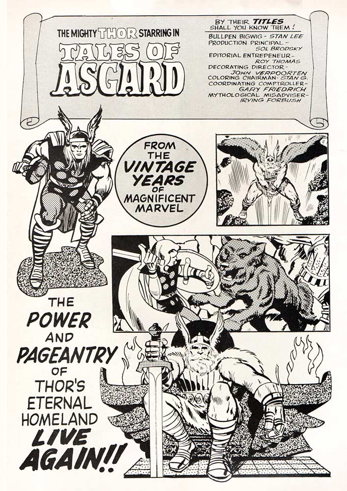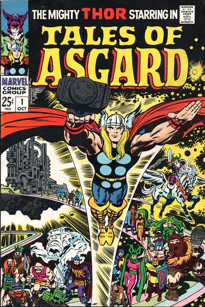 There’s one other Marvel 25-center for 1968, which looks like an Annual, but I suppose really isn’t. It’s Tales of Asgard #1, starring the Mighty Thor, which reprinted ten of the back-up stories from Journey Into Mystery #s 97 through 106, all by Stan Lee and Jack Kirby. It doesn’t have the “Twice As Many Pages! Twice As Many Thrills!” corner box trade-dress of the other 1968 Annuals, even though it was released during the height of Annual Season, on July 16. I include it on my spinner rack with the other Marvel Annuals, though … just for old time’s sake, and a fond memory of another summer Marvel 25-cent book. And, oh, that Kirby cover. Thor never looked so good.