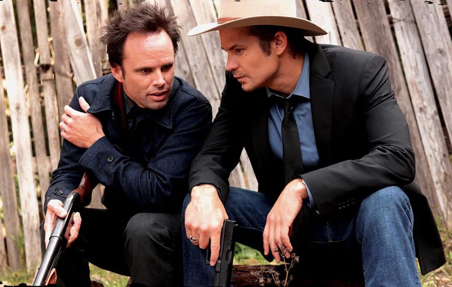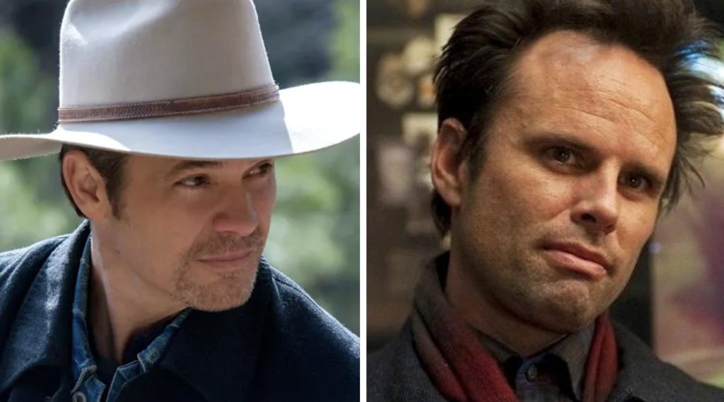 Timothy Olyphant as US Marshal Raylan Givens and Walton Goggins as his nemesis, Boyd Crowder.