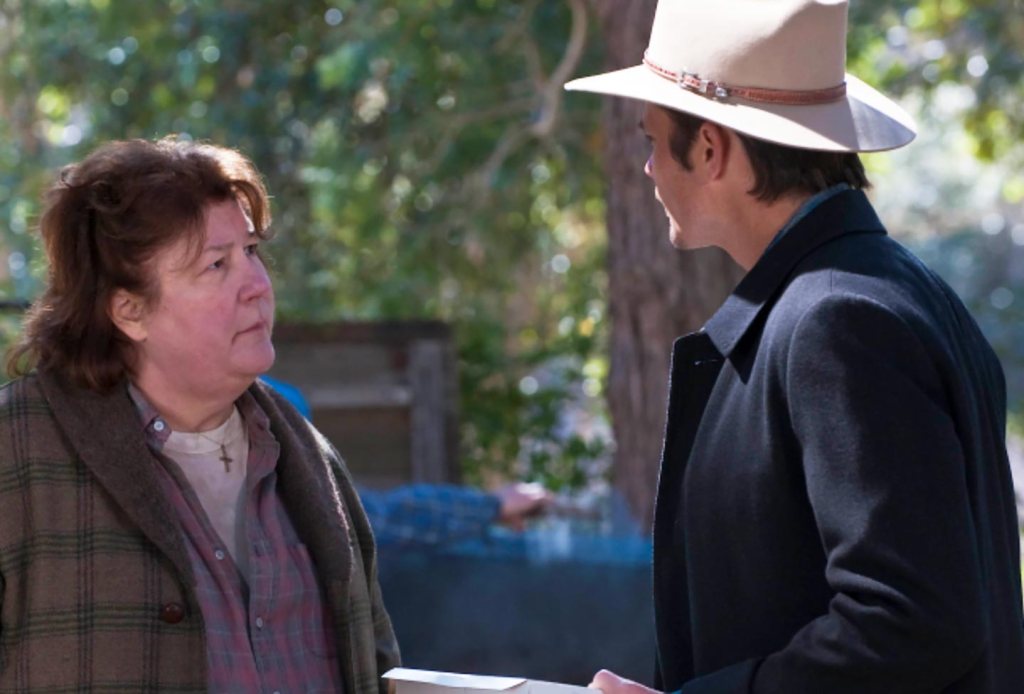 Season five is my least favorite. It introduces Dewey Crowe’s extended family, his kinfolk from the Everglades in Florida. One of the reasons I disliked it originally is the presence of actor Michael Rapaport as Daryl Crowe Jr., the leader of the Crowe family, Southern branch. I’ve never liked Rapaport as an actor and still don’t, but to be honest, my second viewing of this season was more enjoyable than the first back when it originally aired. It’s apparent that the producers and writers were looking for another extended crime family to rival the Bennetts in season two; sadly they don’t quite get there. This season also introduces Mary Steenburgen as Katherine Hale, a famed Kentucky criminal kingpin, whose dead husband was a crime lord; she’s an ally of Wynn Duffy and recurs as one of the two big bads in season six, the final one.