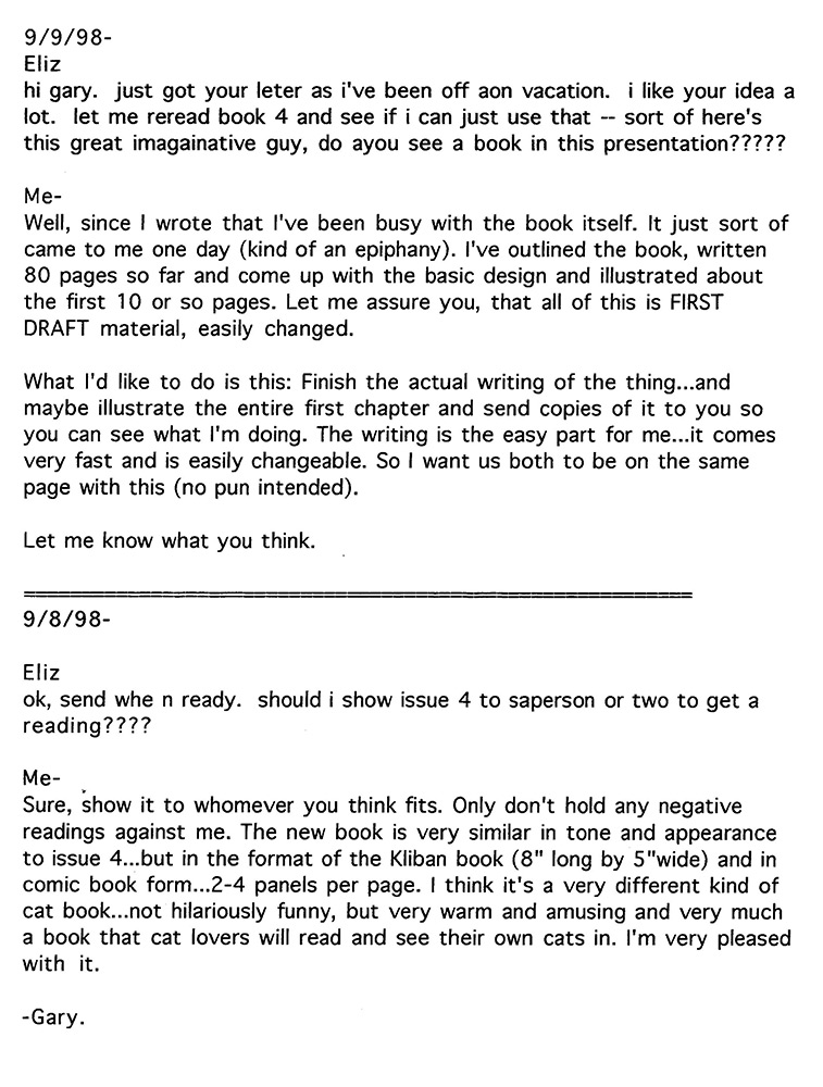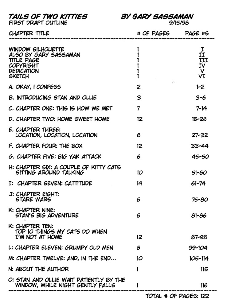 A cover sheet I made for Tails of Two Kitties; the original outline, totaling 122 pages; and some initial conversations with “my agent.”