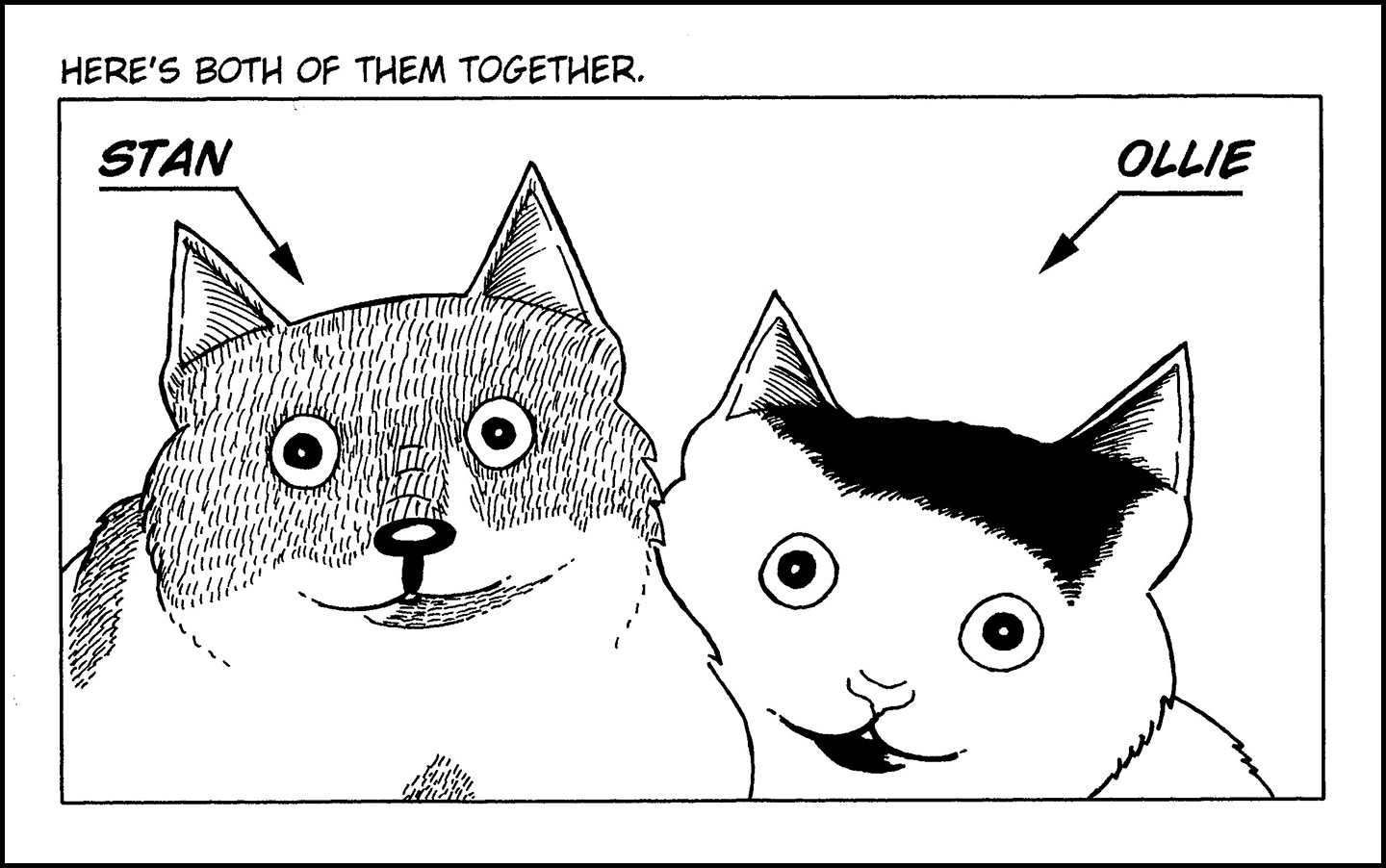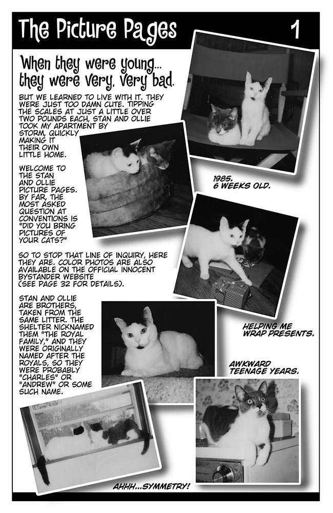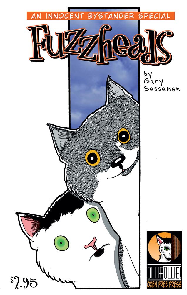 I have a shelf of “workbooks” in my bedroom. I made these books when I was creating my self-published comic book series, Innocent Bystander, in the 1990s. They contain all my production stuff, plus ancillary material about the books, like reviews, ads, etc. When it was obvious to me that IB wasn’t going to take off and make me a millionaire, I toyed with the idea of taking one of my most popular issues—#4, the one starring my cats, Stan and Ollie—and making it into an extended book. That book was originally called Fuzzheads, because, somewhere in the dim past I remembered a movie where a woman repeatedly bellowed at the top of her lungs, “FUZZHEAD!!!”, trying to get a pet that had run away to come home. I guess that word just stuck with me.