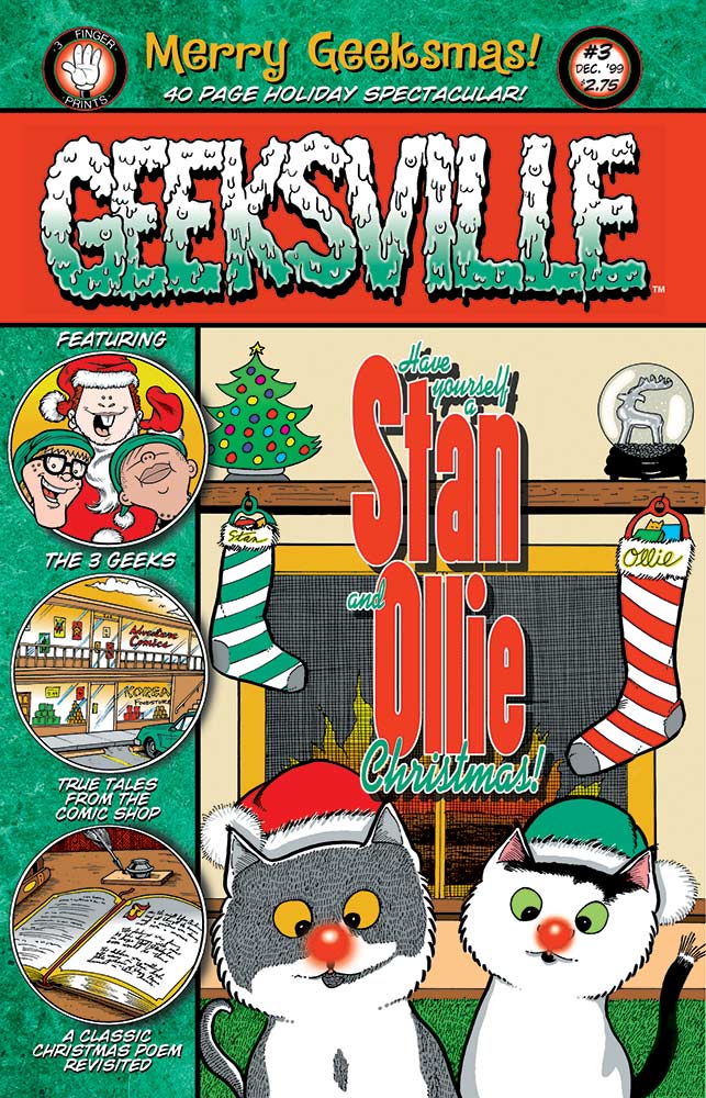 The cover and splash page to my “Have Yourself A Stan and Ollie Christmas!” story from Geeksville #3, published in 1999, which featured art reformatted from Tails of Two Kitties.
