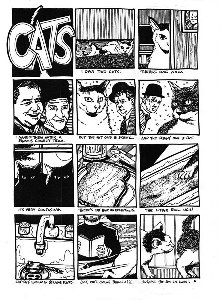 Using my cats as fodder for my comic books was something that started in the very beginning; in fact, the first-ever comics page I wrote and drew was titled simply “Cats” and featured Stan and Ollie. That one-page story appeared in Innocent Bystander #1 (1995), and I did subsequent S&O one-pagers in IB #2. While I didn’t get very many letters or emails in those days, one request did recur: MORE CAT STUFF!, sometimes scrawled in purple crayon with disturbing drawings (okay, I made that part up; sometimes it was red crayon). So after the success of my third issue, which was devoted to the Marx Brothers, I decided my second “themed” issue would be wrapped around Stan and Ollie. One local Pittsburgh comics store sold over 60 copies of that issue, based solely on the poster they hung on their front door. They barely sold more X-Men comics at the time. I thought maybe I had lightning in a bottle, but it turned out I just had a bit of a tempest in a litter box. Still, “The Boys”—as I sometimes called them—were seemingly meant for my comic pages.