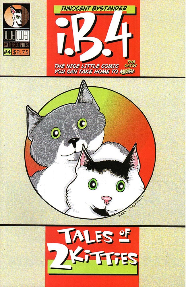 My very first comic book page, “Cats,” from Innocent Bystander #1, and the front and back covers from issue #4 featuring the original “Tales of 2 Kitties.”