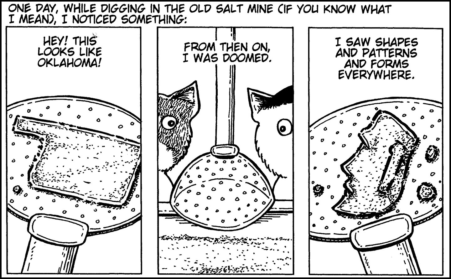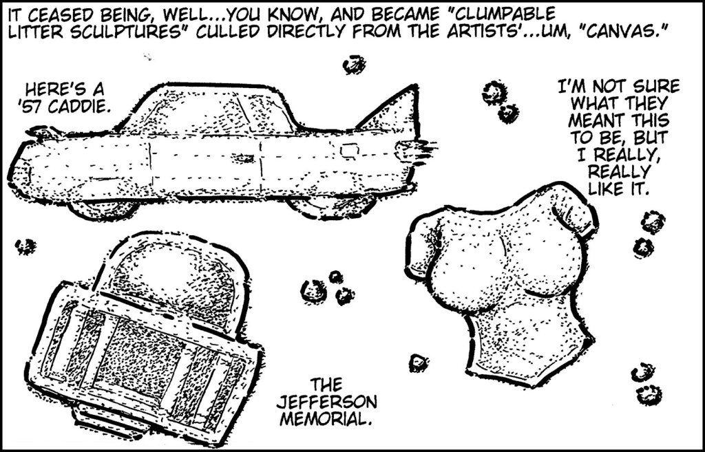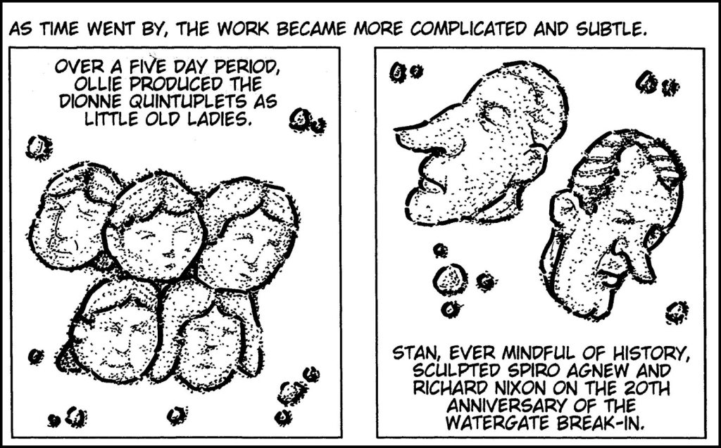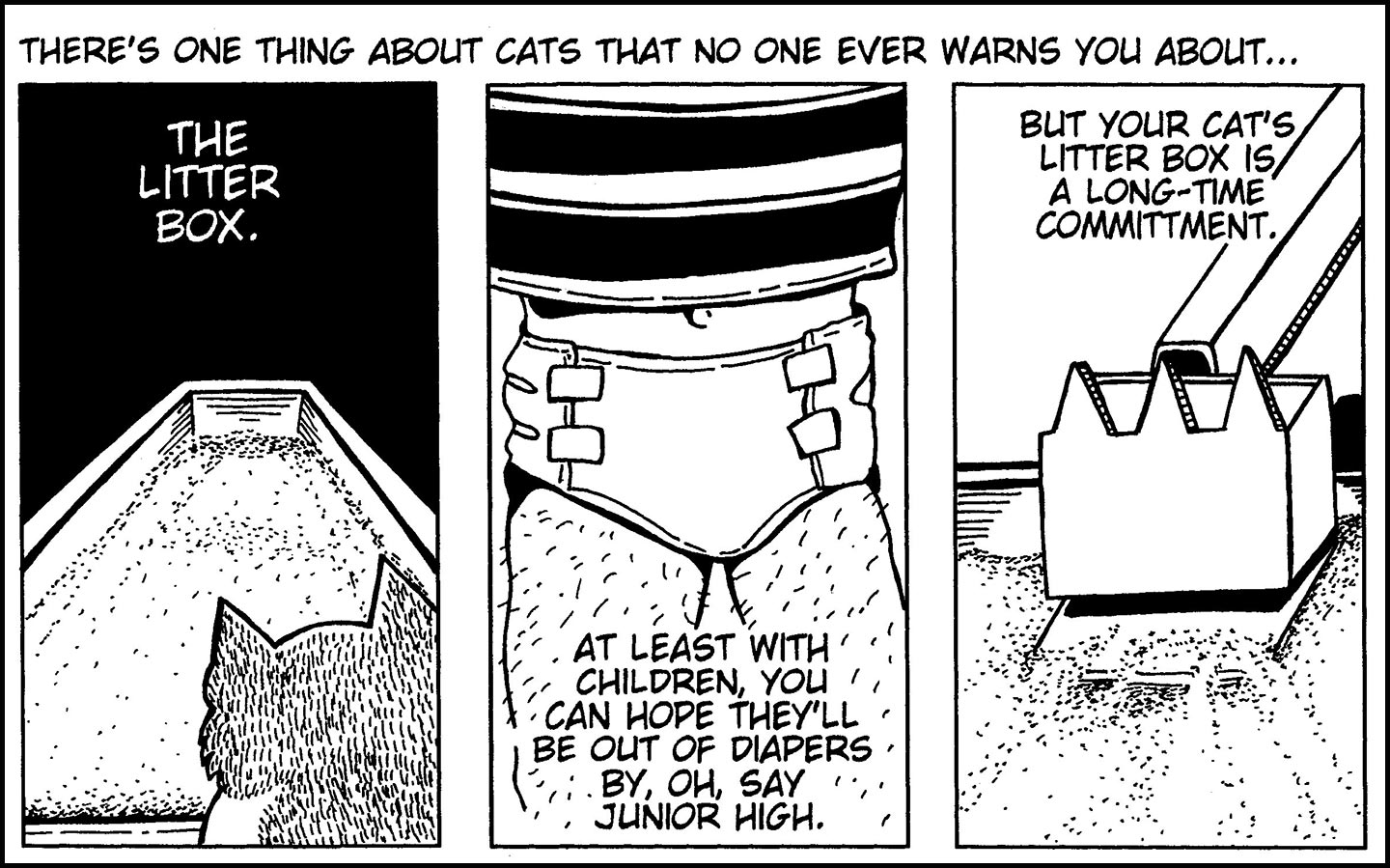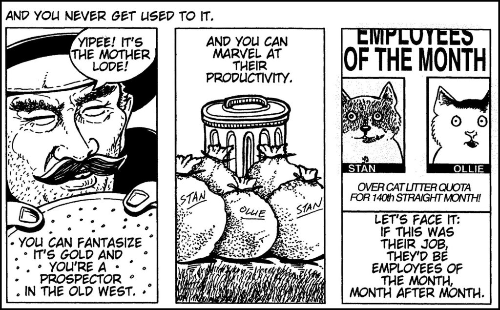 This would have been chapter four, and it chronicles “The Box,” my repulsion and dedication to the daily chore of cleaning out Stan and Ollie’s litter box. It seemed to me a perpetual motion machine: They ate. They pooped. I scooped. Clumpable litter lent itself to visions of some strange kinds of sculpture, but in truth, the only one I ever really saw was the one that resembled the state of Oklahoma. All the others were absurd constructs. I’m sure both cats never knew who Nixon and Agnew were, let alone the Dionne Quintuplets. (Well … maybe Ollie did. He was the smart one.)