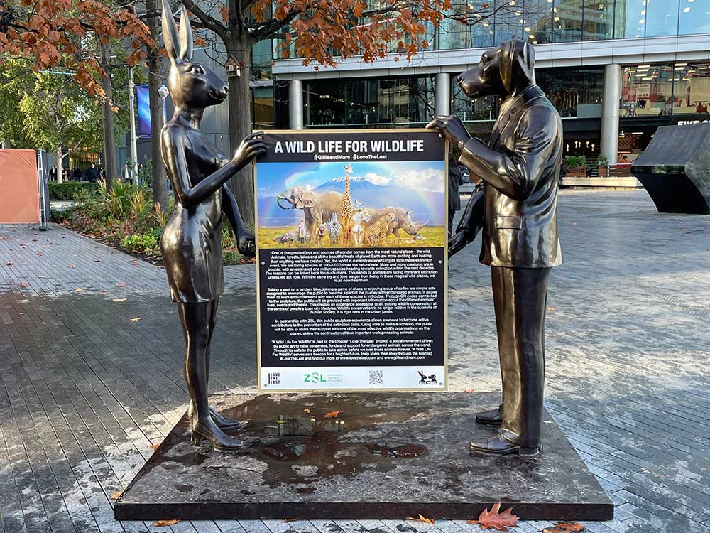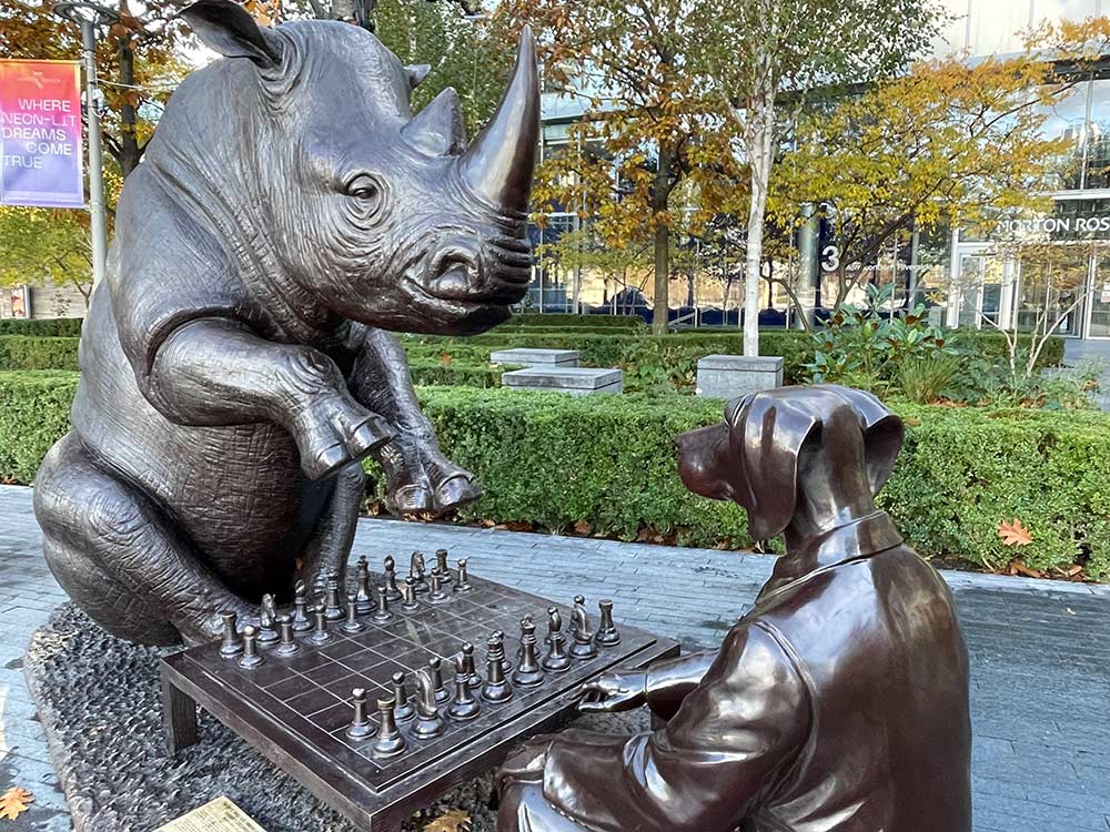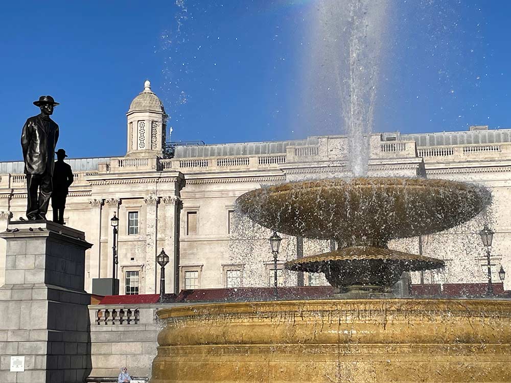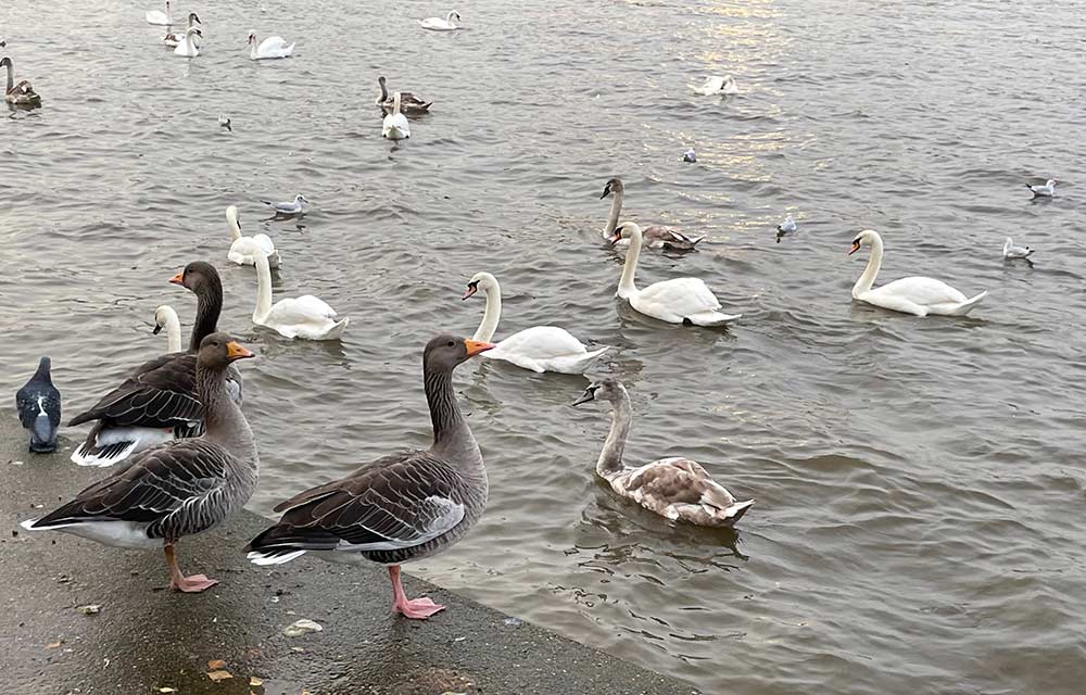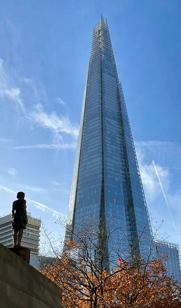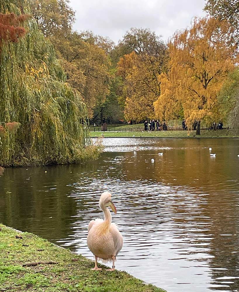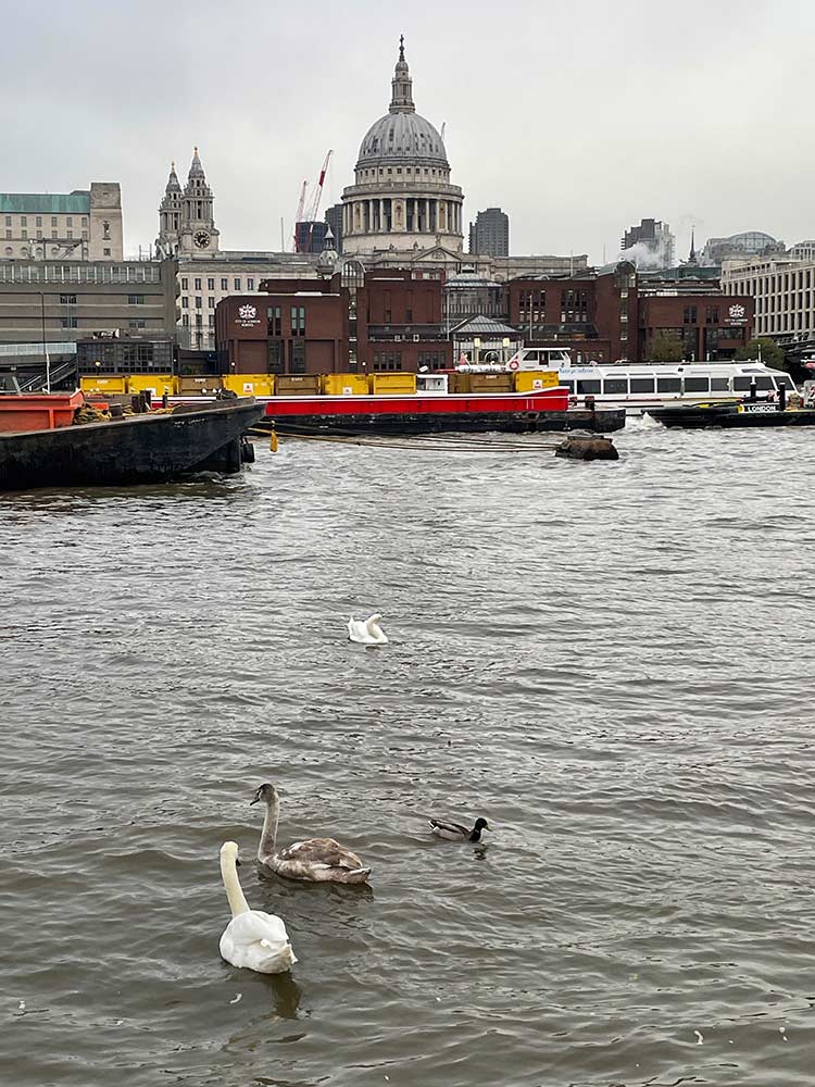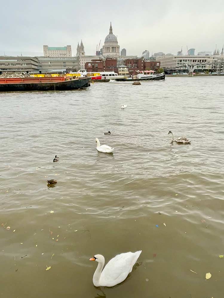 That walking took me up the Thames to Westminster Bridge and Big Ben. While I was taking my lazy-ass time in the brisk morning air, just before I got to the London Eye I heard, “GARY!” and turned to see my friend Jeannine—literally the ONLY person I know in London—walking with a friend. Even London is a small world, I guess. I stopped and paid my respects to my favorite UK statue, Winston Churchill, even though I know his imperialist world view is not very popular these days (my personal view: he helped save the freakin’ world in World War II). I walked through the lovely (and very crowded, people- and bird-wise) St. James Park on my way to Trafalgar Square (those giant eyeballs represent a remodel of the National Gallery) and then onward to pick up some final books at Waterstones Piccadilly and Christmas gifts at Fortnum & Mason. I made a short stop in Burlington Aracade, coming out on the other side where all the posh stores, like Cartier, Ralph Lauren, and Stella McCartney are, but the streets were really filling up, so I made a beeline back to the safety of Bankside, where it was less crowded. I ended the afternoon with a nice long walk up along the Thames, past the City and Tower of London, and Tower Bridge and back via Southwark Street (hence the views of The Shard). Those statues of animals doing human things were part of a program throughout London called “A Wild Life for Wildlife.” I also saw similar statues at Battersea Power Station. The swans were back near the Millennium Bridge once again, this time observed by giant geese, hovering like some kind of superhero protectors of the realm.