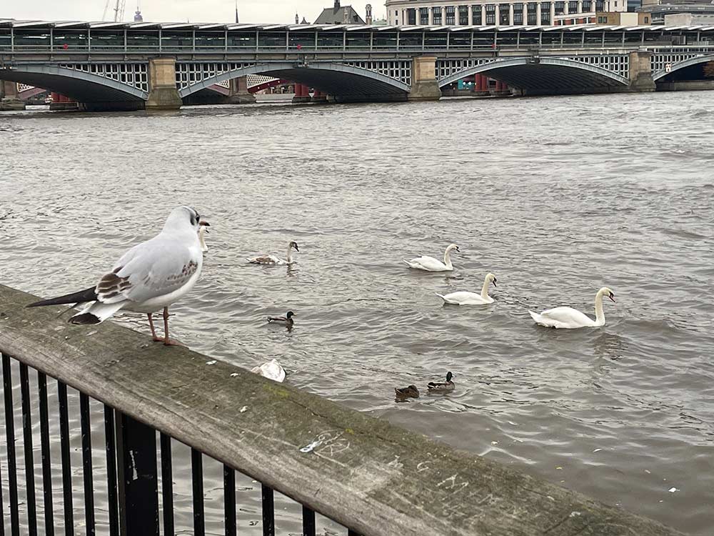 Thursday was a bit of short day for me, as I went back to Bankside and stopped in a bar/restaurant right behind Tate Modern (its name escapes me) to have fish and chips. I had been in the UK for a week and still had not had a proper dose of this British staple. I had eaten here before, too, and the F&C were very good, even if the service was absolutely awful (both times, so at least they’re consistent). The swans were out swanning again, so I took some more photos, including the one with the voyeuristic seagull patiently watching and waiting for the guy who fed the swans to show up … free lunch!