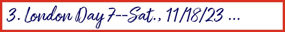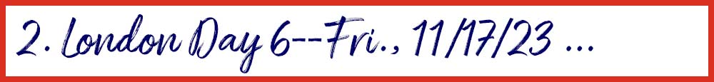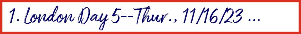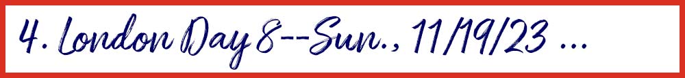 Here’s the second half of my November 2023 trip to London, covering Thursday, November 16 through Sunday, November 19, the day I climbed onto that big metal bird adorned with the red and blue of the British flag on the outside and took an 11-hour journey back to San Diego.