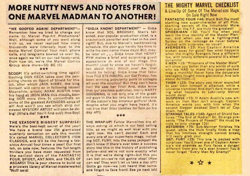 These issues debuted the second Bullpen Bulletins page, hitting the newsstands in the first two weeks of October, but all five are still cover-dated for December. It features Stan’s “WE GOOFED!” Item about the Marvel Pop Art Productions name-change that we covered in our first installment of December 1965 (click here to read it). Amongst the “MORE NUTTY NEWS AND NOTES FROM ONE MARVEL MADMAN TO ANOTHER!”, Flo Steinberg’s college campus popularity and Martin Goodman was one of the nation’s top amateur golfers. (Hey, Stan … you got the job, okay?) Also, this second page revealed the secret of the mailing tube from the first Bullpen page: a giant Spider-Man wall poster! I think we actually had this one, if I remember correctly. It was the first Marvel poster, although more would follow later in the decade and into the early 1970s from Marvelmania (if you were lucky enough to actually get what you ordered) and from outside vendor Third Eye Press, who did the black light posters utilizing Marvel art. Abrams Marvel Arts have been reprinting the Third Eye stuff, in beautiful full-size poster sets, replicating the look and feel of the original—and exceedingly rare in good shape!—posters and notecard set.