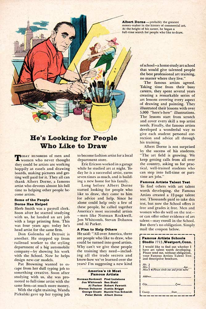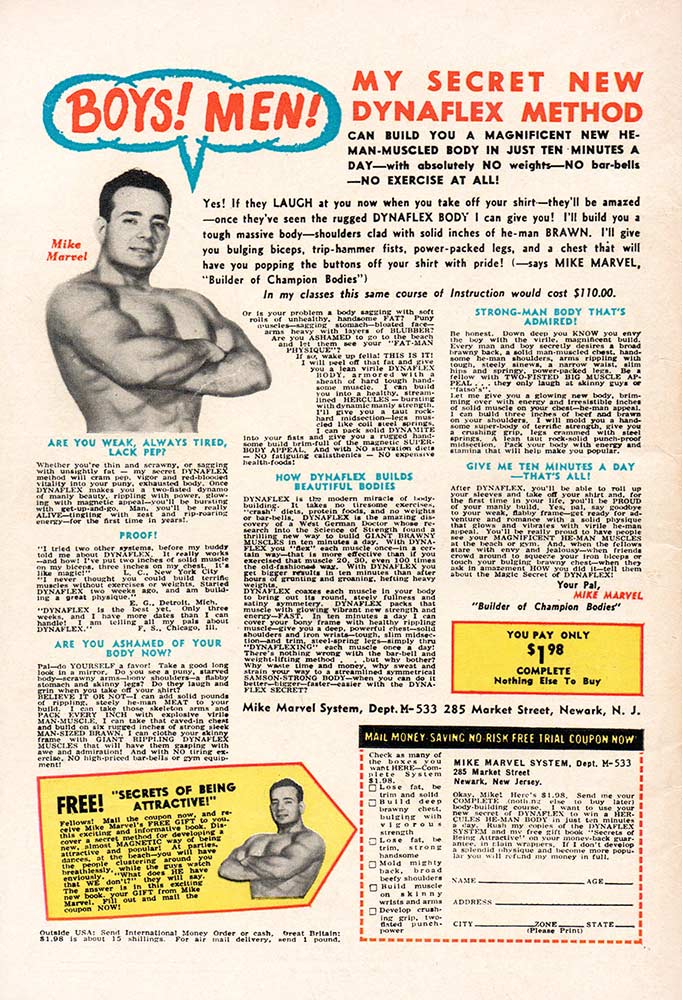 Our final observation about these December 1965 cover-dated comics concerns their back covers. On the superhero and Western books released in September, the back cover featured one of the quintessential ads to appear on Marvel Comics in the 1960s: The Famous Artists School. “He’s looking for people who like to draw,” headlined the ad next to a drawing of illustrator Albert Dorne. I can tell you that I was almost an alumni of the Famous Artists School, having taken the test and having a representative of the school show up at my front door for an actual interview. It was not to be, however. In October, the OTHER quintessential ad appeared, featuring muscle man Mike Marvel, extolling his new “Dynaflex Method” to build muscles. I had a friend who was convinced that Mike Marvel owned Marvel Comics, and that’s why his ad was on the back covers of so many Marvel books. I couldn’t convince him otherwise.