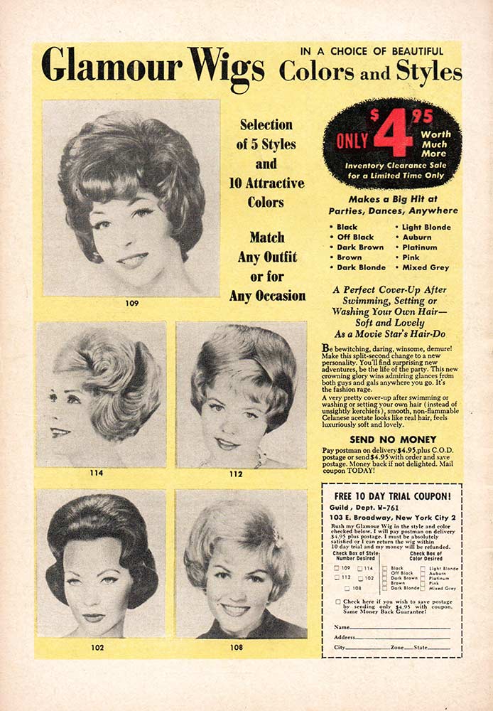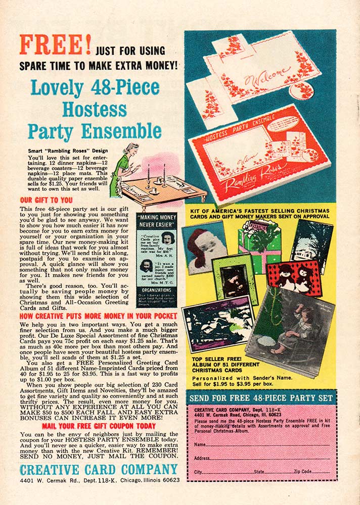 The romance line had their own ads inside and outside their books. The December cover-dated books that appeared in September had an ad for a “Lovely 48-Piece Hostess Party Ensemble,” that will make you the “envy of neighbors” (they evidently didn’t meet all of my neighbors). You just had to sell Christmas cards to get it. The books that came out in October had a choice of “Glamour Wigs … in a choice of colors and styles” for just $4.95! “Soft and lovely as a movie star’s hair-do!” Now, ladies … how could you pass that up. Interior ads in the romance books included “Stop Ugly Nails!”, “A Poetic Tribute to Our Late and Beloved President,” “Reduce Your Measurements” and “100 Little Dolls” on the same page, and the classic “Don’t Be Fat!” Also, for some strange reason, the Millie and Patsy books included an ad for that comic book staple, “Monster-size Monsters! Full 6 Ft Tall in Authentic Colors for Only $1.00!” I guess comics-reading girls in the 1960s liked monsters, too.