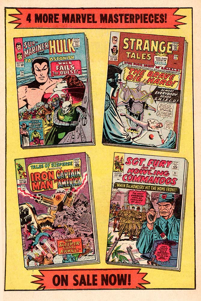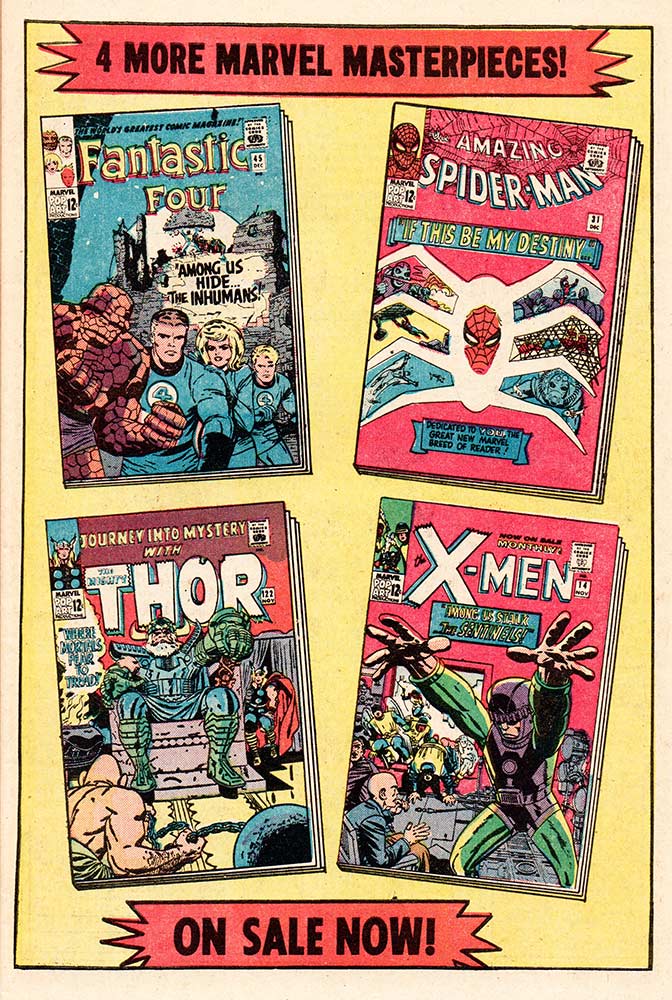 Here are the final five December 1965 cover-dated comics from Marvel. They were released in a different month and one of the easiest ways to tell this is to look at the back cover ads, which we’ll do at the very end of this post. But first, let’s look at the books themselves.