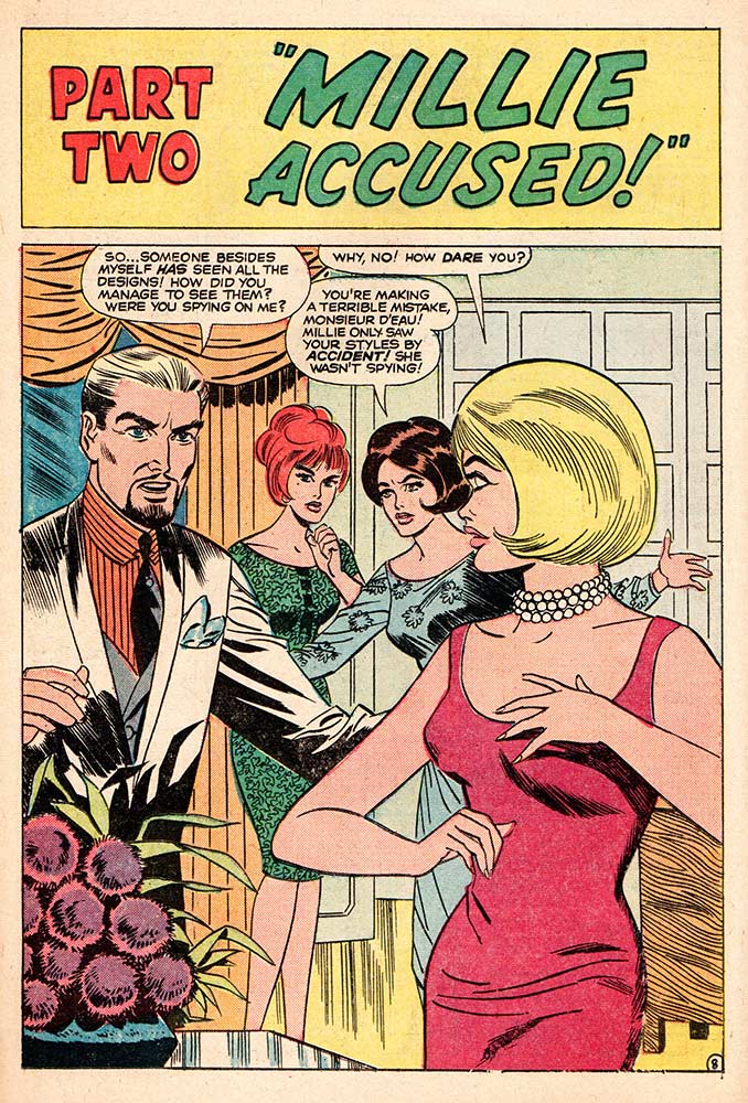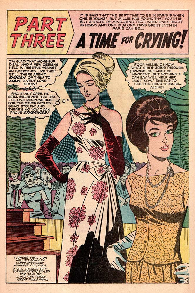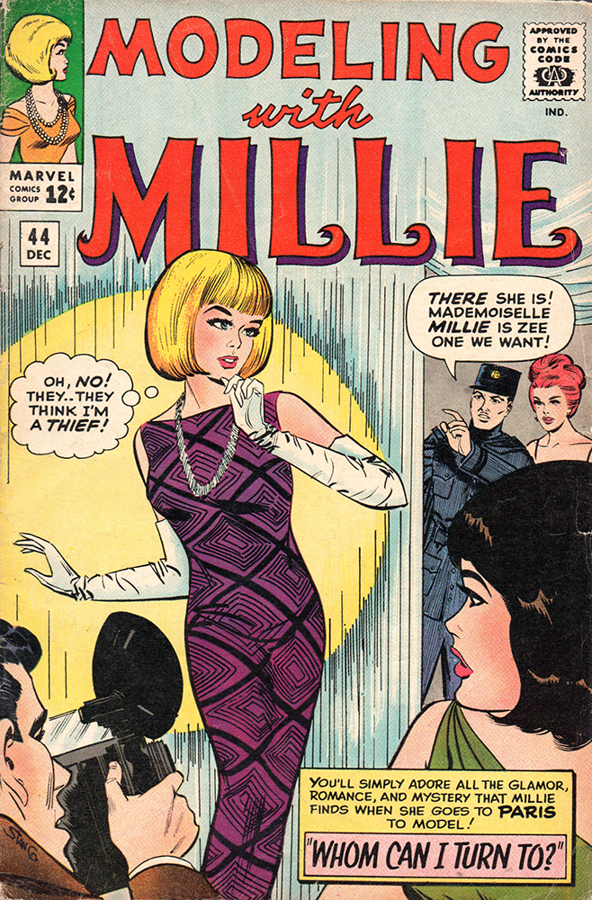 Our friend Millie was so popular, she warranted two Marvel books, and this very issue may just be the first writing assignment Roy Thomas had at Marvel. He joined the staff in July of 1965 after just a few days working for notorious grouch/Superman editor Mort Weisinger at DC. Thomas met Stan Lee for lunch, went up to Marvel and passed their writing test. He gave Weisinger his notice, and was promptly told to leave. Back at Marvel less than an hour after he left his first meeting there, Thomas was given a “Millie the Model assignment to do over the weekend.” This story, “Whom Can I Turn To?”, a three-parter that has Millie on a modeling gig in Paris and accused of being a thief, is most likely yet another in a series of firsts for the December 1965 cover-dated Marvel publications. The story is 18 pages long, with five pages devoted to the usual Millie fashions and hairdos sent in by readers.