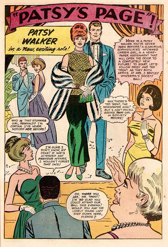 Patsy Walker #124 is a “Super Special Sensation” featuring “The 3 Faces of Patsy!” The “Surfing Sweeties” splash page reveals an important announcement, telling readers they were getting three Patsy and Hedy six-page stories this issue, one with romance, one with glamour, and one with action, plus the prerequisite fashion and hairdo pages, including one for Hunk of the Month, Buzz Baxter. Patsy urged readers at the end of the book to write in and tell her what her assignments should be as the new editor of the women’s page in the newspaper. J. Jonah Jamison eat your heart out!