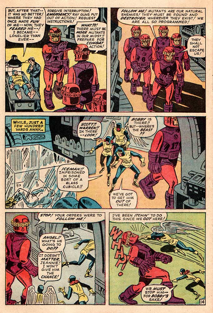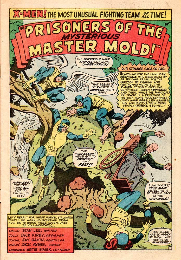 The X-Men #15 is the second issue of a two-parter that introduced the Sentinels to the Marvel Universe, a group of sentient robots/androids/whatever Stan was calling them this issue, that were mutant hunters. This issue has Jack Kirby credited as “designer,” with “Jay Gavin” as penciller and Dick Ayers as inker. I’m guessing that was a clever way for Stan to say Kirby did the layouts, yet again, as another penciller was being broken in to the Marvel style of storytelling. This issue also features a small origin of the Beast, basically two pages or so, told while Hank McCoy is a prisoner of the Sentinels. Because of that, this particular book commands a steeper price. X-Men had just gone monthly with #14 and still felt kind of lost, a feeling even ten-year-old me could sense almost 60 years ago. Like the “Nick Fury, Agent of S.H.I.E.L.D.” series, which I mentioned last time (click here to read it), X-Men wouldn’t become the series it was meant to be until the right writer/artist team came along. In their case, it was—for a very brief time—Roy Thomas and Neal Adams, but the series really had to wait another decade or so for the coming of Chris Claremont and John Byrne to become the legendary book it was meant to be.