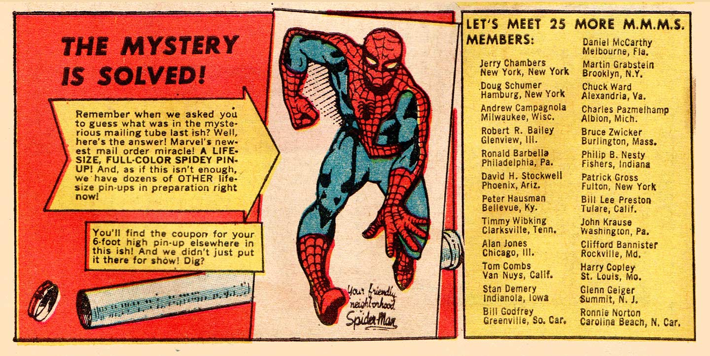 These issues debuted the second Bullpen Bulletins page, hitting the newsstands in the first two weeks of October, but all five are still cover-dated for December. It features Stan’s “WE GOOFED!” Item about the Marvel Pop Art Productions name-change that we covered in our first installment of December 1965 (click here to read it). Amongst the “MORE NUTTY NEWS AND NOTES FROM ONE MARVEL MADMAN TO ANOTHER!”, Flo Steinberg’s college campus popularity and Martin Goodman was one of the nation’s top amateur golfers. (Hey, Stan … you got the job, okay?) Also, this second page revealed the secret of the mailing tube from the first Bullpen page: a giant Spider-Man wall poster! I think we actually had this one, if I remember correctly. It was the first Marvel poster, although more would follow later in the decade and into the early 1970s from Marvelmania (if you were lucky enough to actually get what you ordered) and from outside vendor Third Eye Press, who did the black light posters utilizing Marvel art. Abrams Marvel Arts have been reprinting the Third Eye stuff, in beautiful full-size poster sets, replicating the look and feel of the original—and exceedingly rare in good shape!—posters and notecard set.