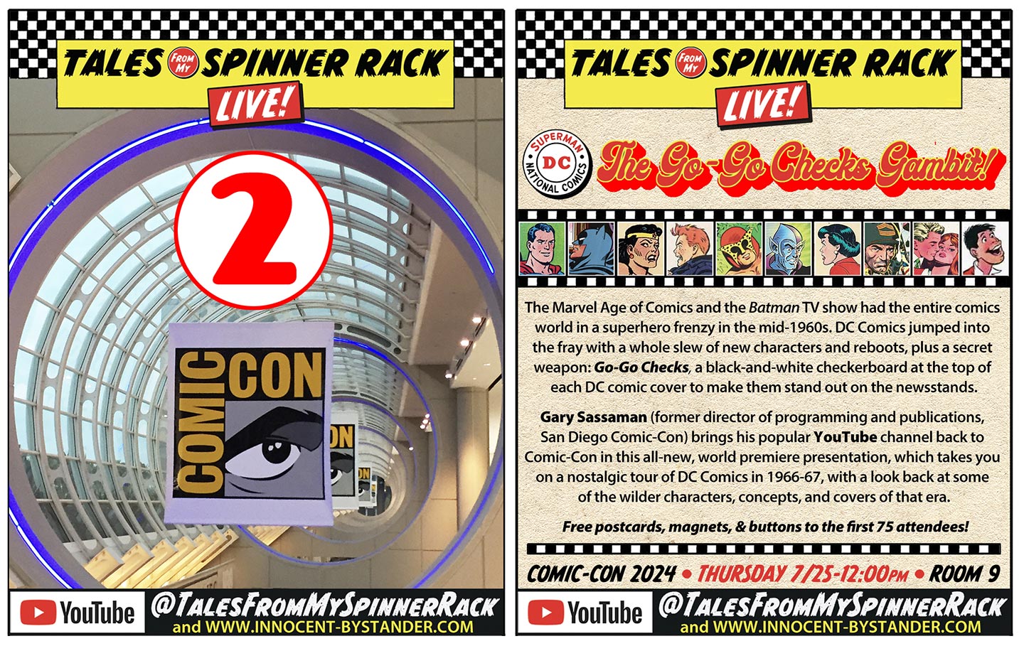 We are just TWO weeks away from Comic-Con 2024, July 25-28 (with Preview Night July 24) at the San Diego Convention Center, and I can now announce that my Tales From My Spinner Rack LIVE! presentation will take place at the event on Thursday, July 25th at 12:00 PM (Noon!) in Room 9!